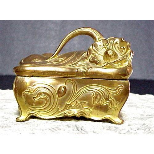 Here is a beautiful old gold gilded jewelry box. It measures about 4 1/2 inches long, 2 1/2" wide and 3 1/2 inches tall. Love the curved Art Nouveau Handle and the flower - Lovely original finest silk lining finished with original cording - Love the gorgeous raised embossing , gorgeous ROSE and foliage, This lovely box stands on 4 tiny feet and it has hinged lid, These to my knowledge date back to early 1900's or late Victorian - Lovely condition, free of cracks or holes -