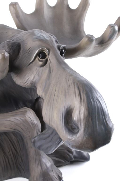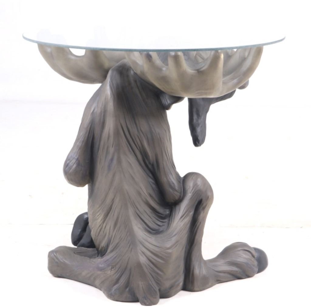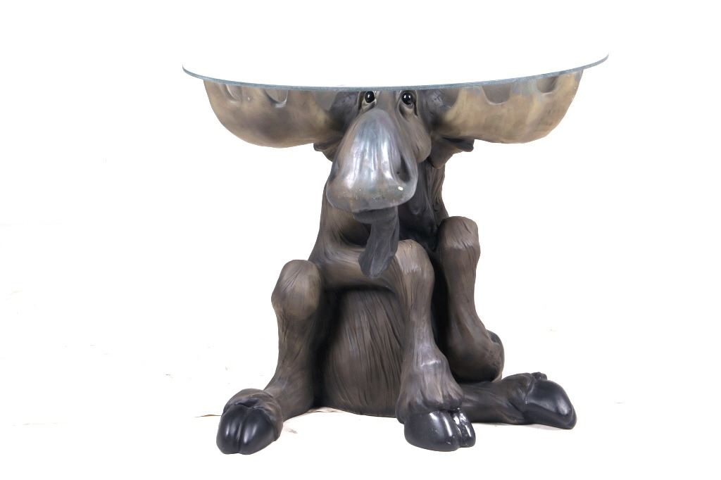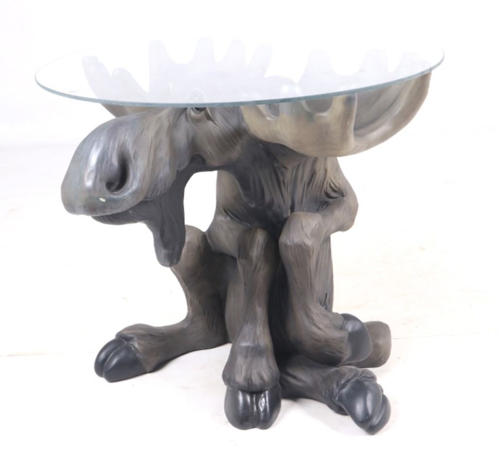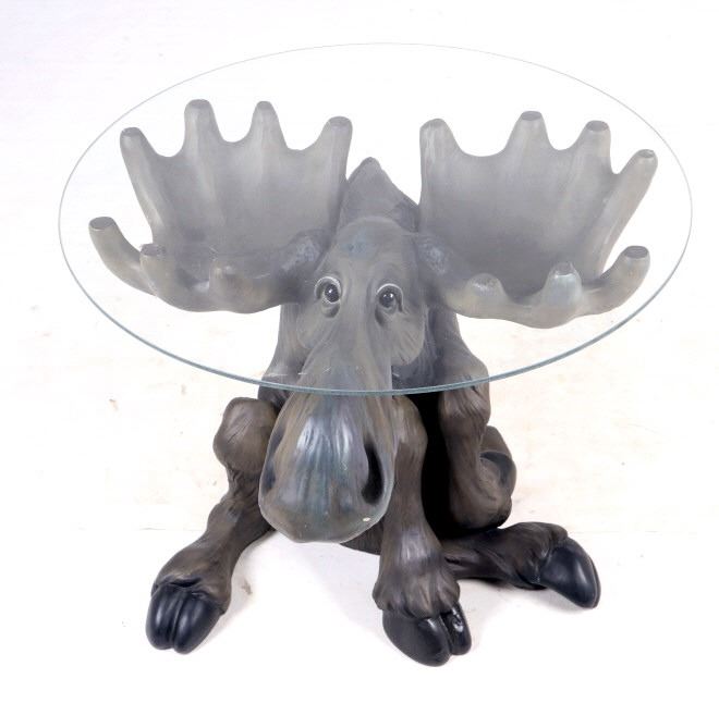 Included in this lot we have a cast plaster Moose glass top coffee table. The table displays a round glass top with the base displaying a cast plaster construction. The base is set in the hand carved shape of a seated moose. The moose displays a caricatured appearance with the large paddle antlers making the supports for the glass table. The moose is signed in the back reading "P D". The piece shows good condition overall with some light wear and damage due to use. The moose measures 21 1/2" wide by 21" tall.