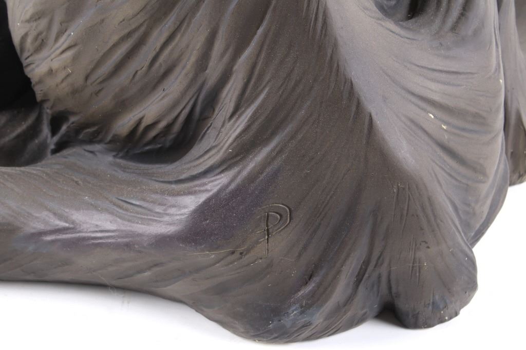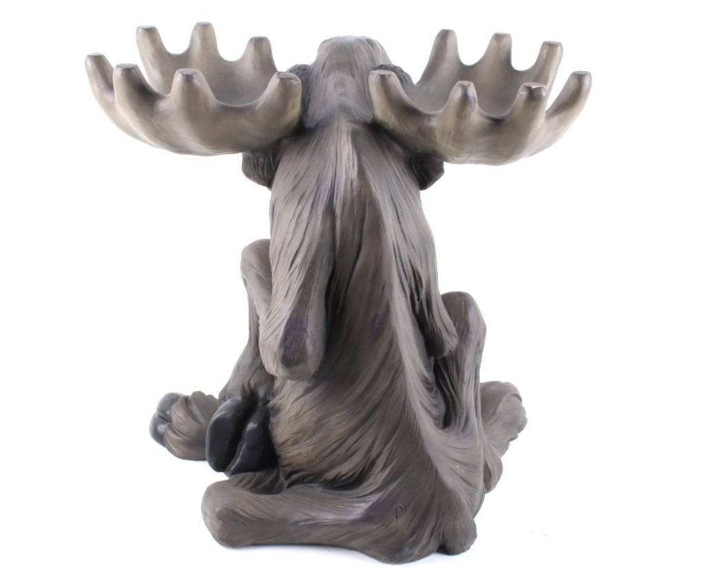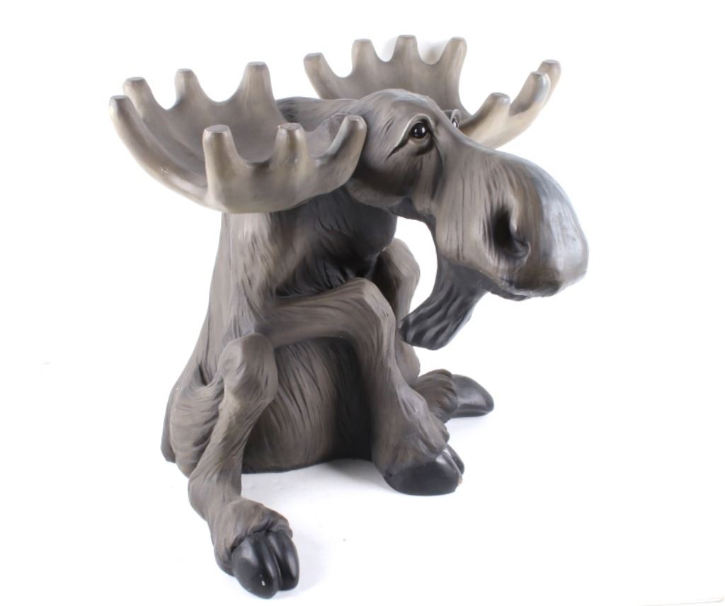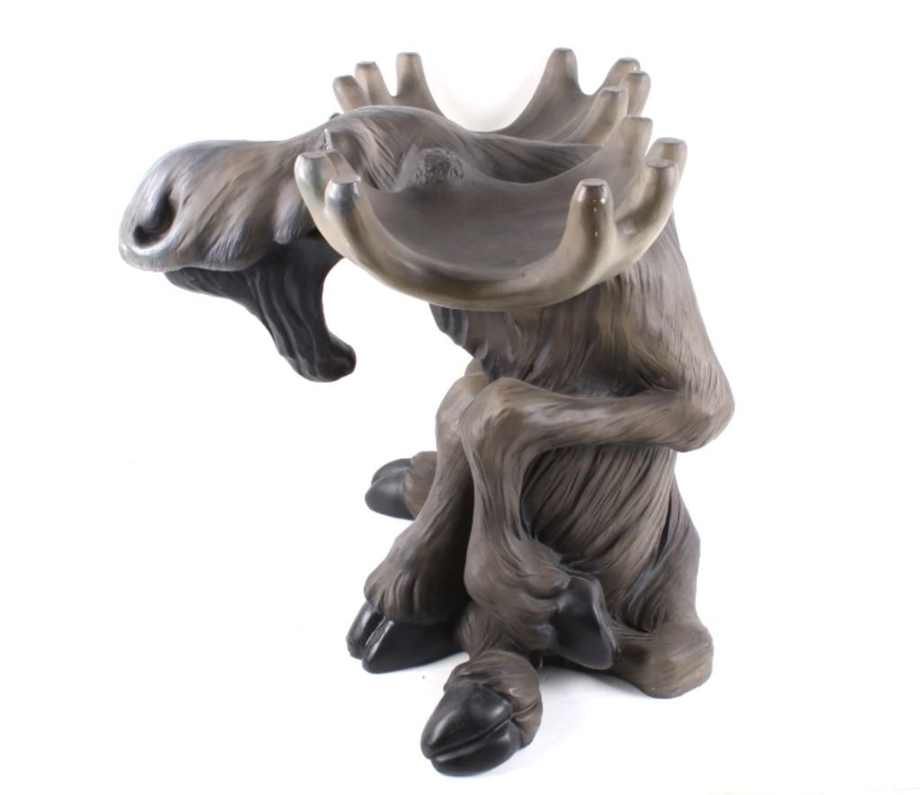 Included in this lot we have a cast plaster Moose glass top coffee table. The table displays a round glass top with the base displaying a cast plaster construction. The base is set in the hand carved shape of a seated moose. The moose displays a caricatured appearance with the large paddle antlers making the supports for the glass table. The moose is signed in the back reading "P D". The piece shows good condition overall with some light wear and damage due to use. The moose measures 21 1/2" wide by 21" tall.
