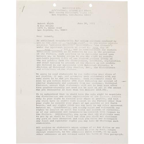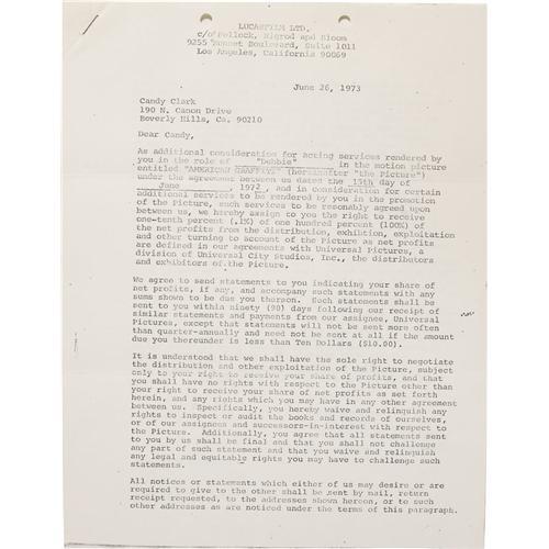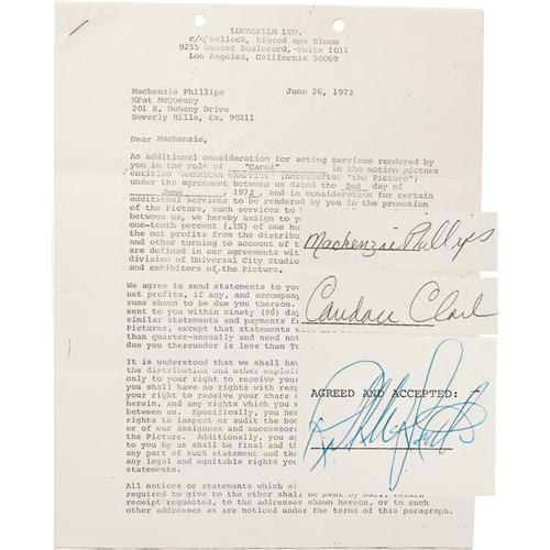 <B>Robert Smith, Mackenzie Phillips, and Candy Clark Signed "American Graffiti" Contracts.</B></I> A set of three contracts on Lucasfilm letterhead dated June 26, 1973, engaging the respective services of Robert "Wolfman Jack" Smith, Mackenzie Phillips, and Candy Clark for roles in <I>American Graffiti.</B></I> Each is signed by the respective performers in blue ink and in overall Very Fine to Excellent condition with very mild tanning, fold creases, and the standard punch holes in the top edge.<I>Accompanied by LOA from PSA/DNA.</B></I><BR><BR><b>Shipping:</b> Small Flat (<a target="_blank" href="http://www.heritageauctions.com/common/shipping.php">view shipping information</a>)
