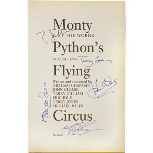 <B>Cast-Signed</B></I> <B><I>Monty Python's Flying Circus: Just the Words</B></I></B></I> <B>Book.</B></I> Funnier than the funniest joke in the world, more thrilling than "The Attila the Hun Show," and almost as unsettling as an exploding penguin on a TV set, this copy of <I>Monty Python's Flying Circus: Just the Words Vol. One</B></I> is signed by cast members John Cleese, Eric Idle, Michael Palin, Terry Jones, and Terry Gilliam on the title page in blue and black felt tip. The book reprints the scripts for several classic Python sketches, and is in Very Fine to Excellent condition with some mild cover wear and corner bumping. <I>Accompanied by a COA from PSA/DNA.</B></I><BR><BR><b>Shipping:</b> Books & Catalogs (<a target="_blank" href="http://www.heritageauctions.com/common/shipping.php">view shipping information</a>)
