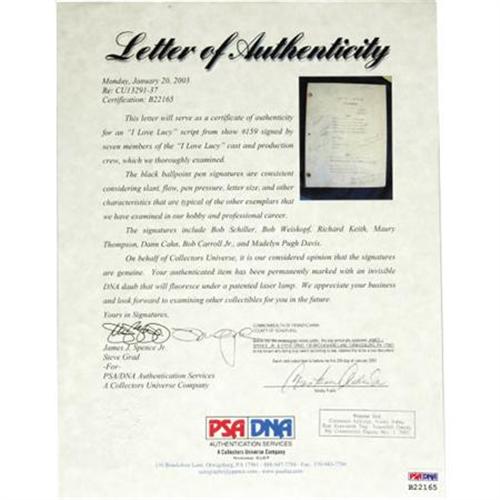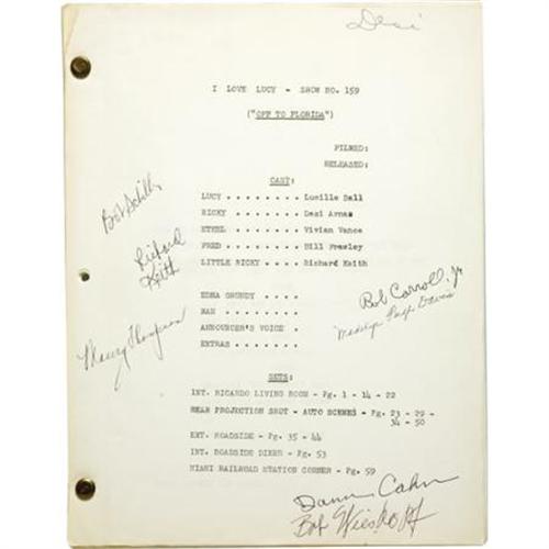 <B>Cast and Crew Signed "I Love Lucy" Script.</B></I> A script for season 6 episode #6, "Off to Florida," signed on the front page in black ballpoint by screenwriters Bob Carroll Jr., Madelyn Pugh Davis, Bob Schiller, and Bob Weiskopf, actor Richard Keith, camera coordinator Maury Thompson, and editor Dann Cahn. In Very Fine condition with mild wear and some light toning. <I>Accompanied by a COA from PSA/DNA</B></I> <I>Accompanied by LOA from PSA/DNA.</B></I><BR><BR><b>Shipping:</b> Flat Material, Small (<a target="_blank" href="http://www.heritageauctions.com/common/shipping.php">view shipping information</a>)
