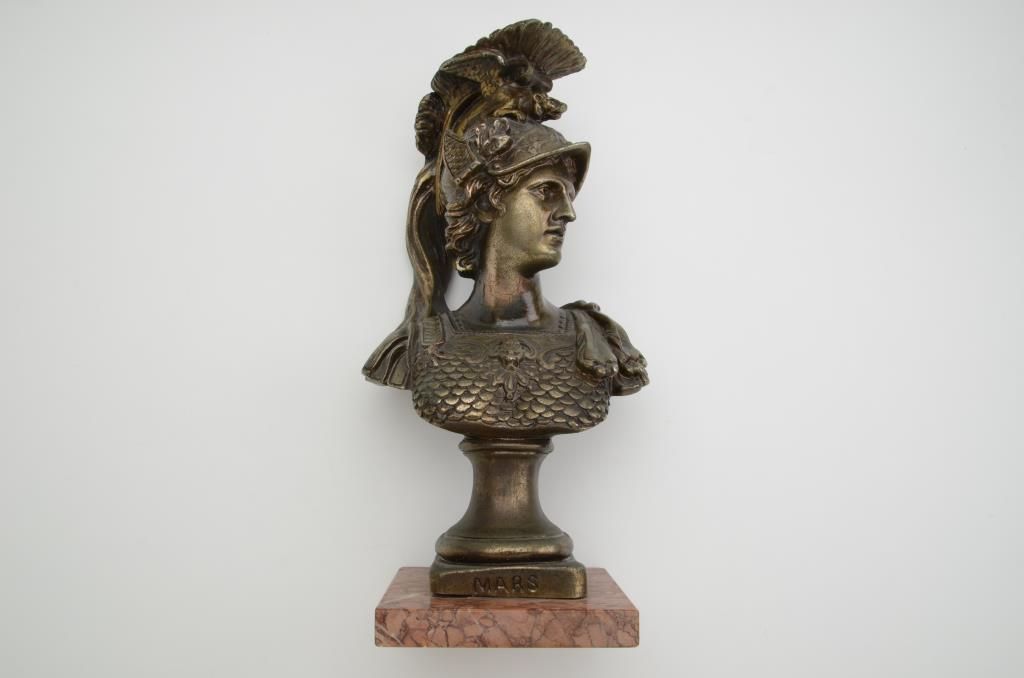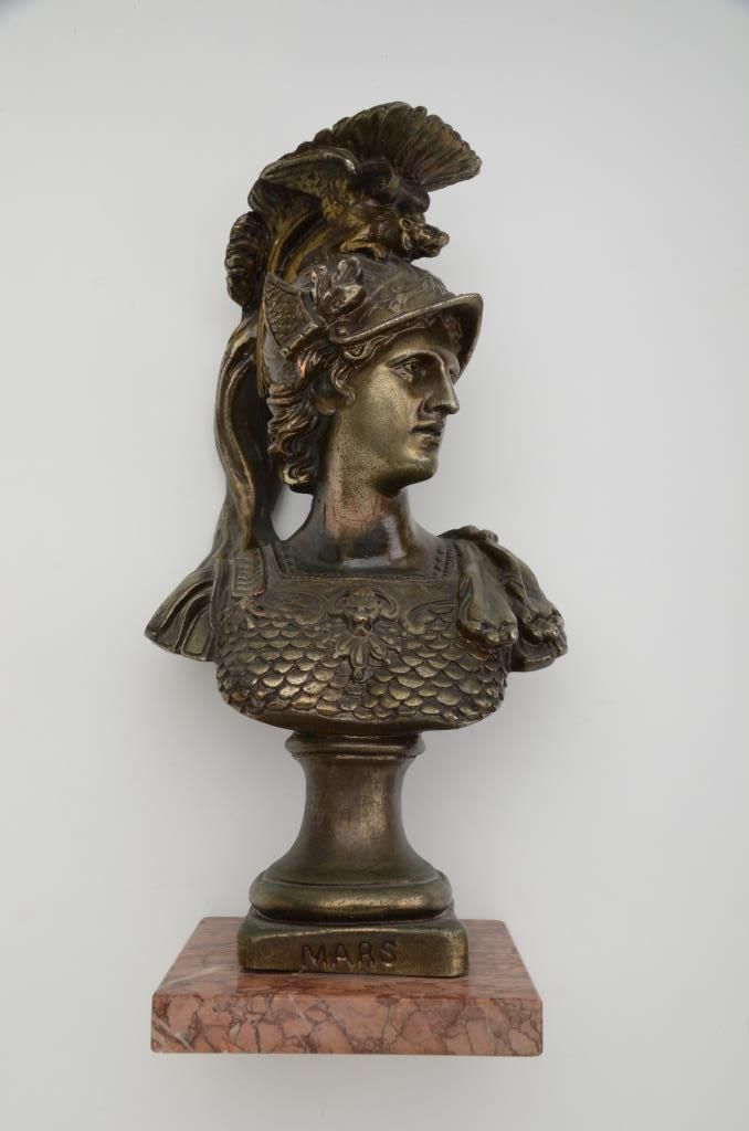 Cast art metal statue on stone base of Mars (God of War), approx. 15” in height in overall good condition; a great decorator for the library or gunroom. Est.: $200-$400.
