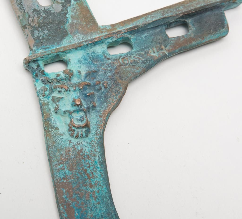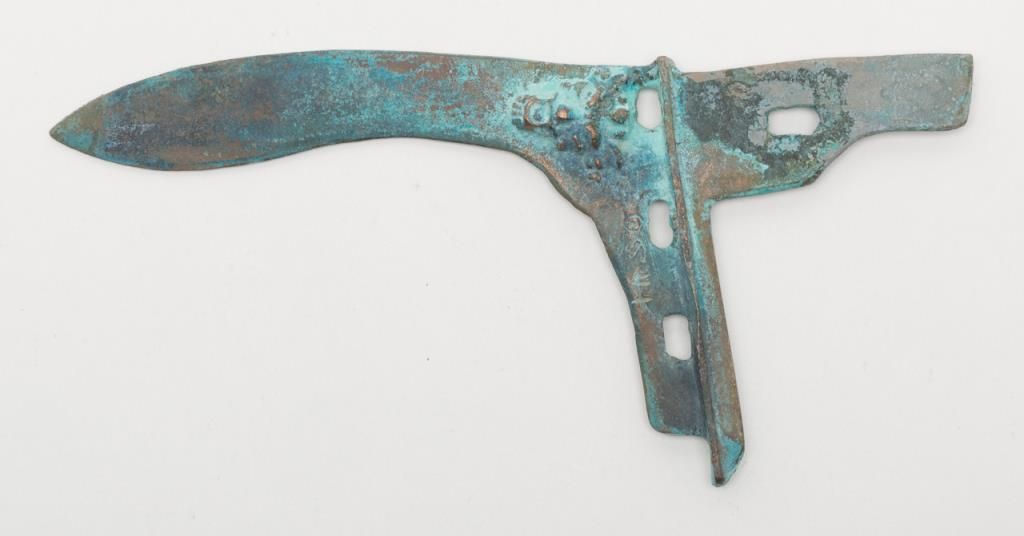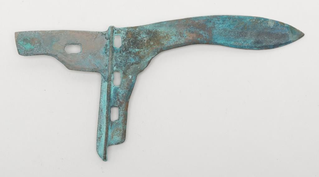 Cast bronze Chinese ax head in ancient style probably old copy showing dark green patina. Est.: $100-$300
