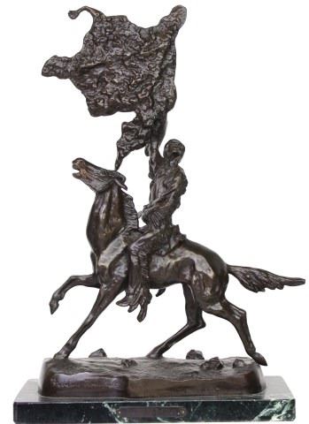 after Frederic Remington 1861-1906 on marble base standing 15" tall. Donated item.