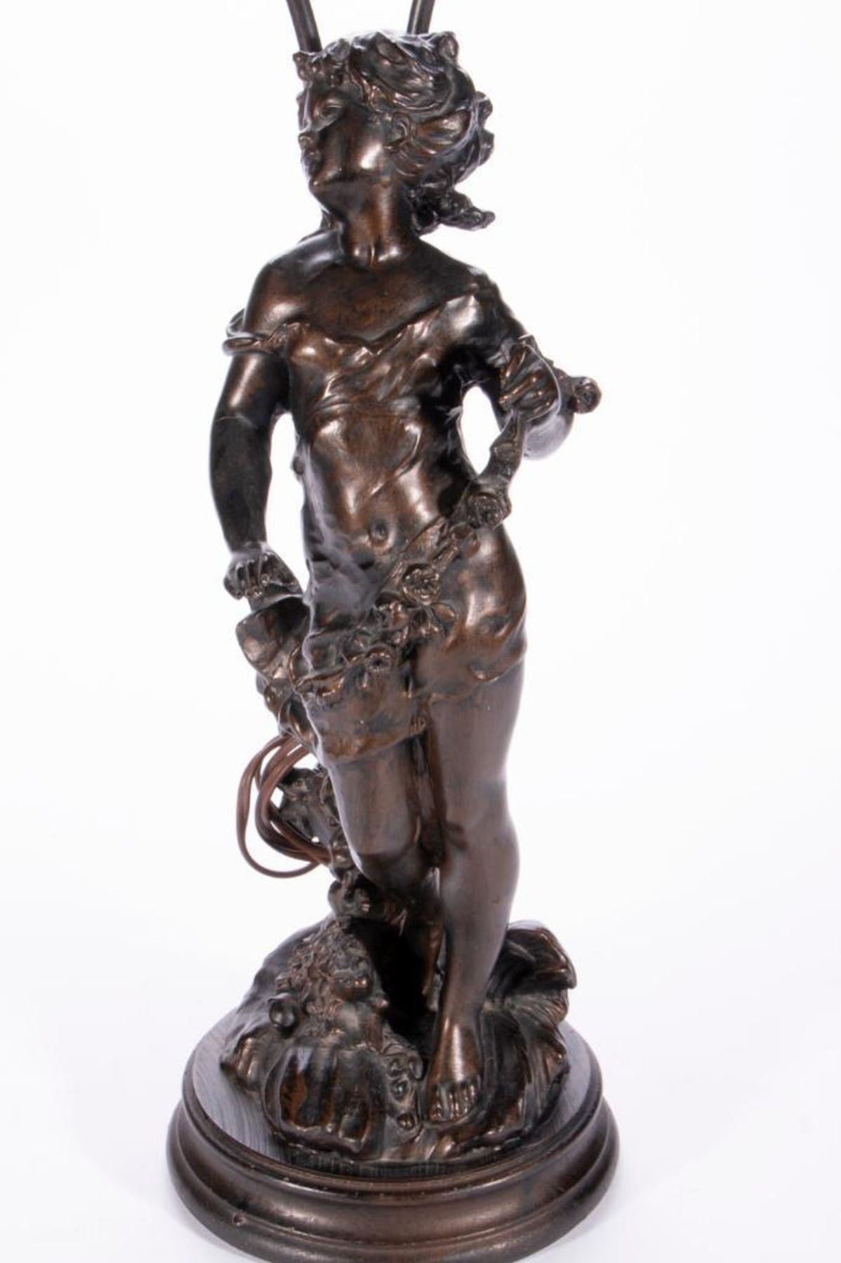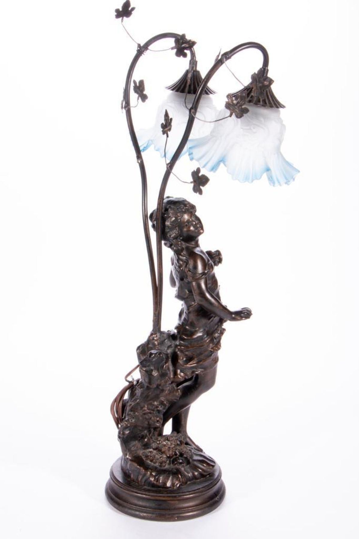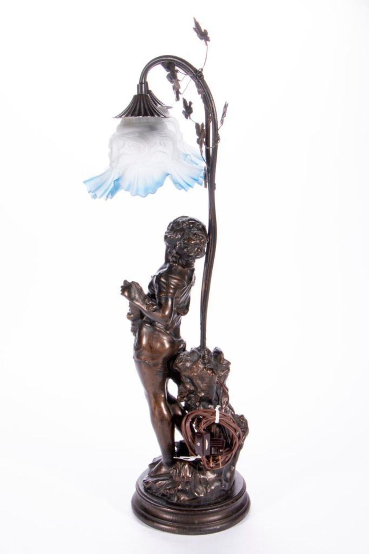 A cast bronze table lamp of a young girl measuring 26 inches high x 7 1/2.
