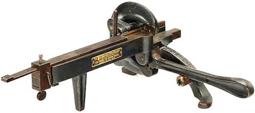 Gußeiserne Zeilenhackmaschine für frühe Setzmaschinen (wie "Linotype"), um 1915 Von H. C. Hansen Type Foundry, Boston & New York". Gemäß U.S. Patent vom 27. Okt. 1914. Maße: 43 x 35 x 16 cm. - Selten druckhistorisches Sammlungsstück!
