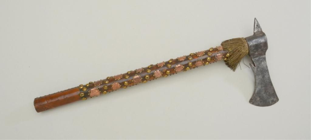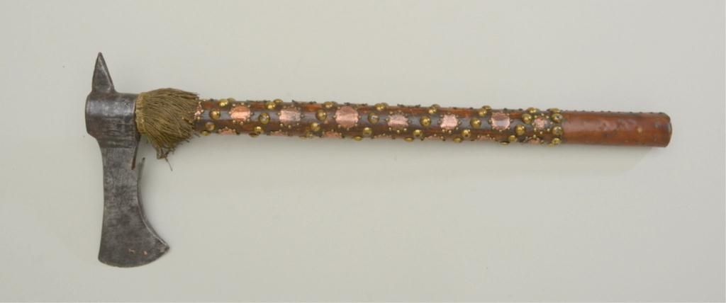 Cast iron axe head with wood shaft that is decorated with what appears to be copper coins and brass tacks; some of the coins are dated including one marked â1 Soldo 1788 Kâ, another marked 1810, another, 1849; base ofshaft is copper or brass wrapped with a dark patina; base of axe head shows tassel trim; likely composite of parts. Est.: $150-$300.