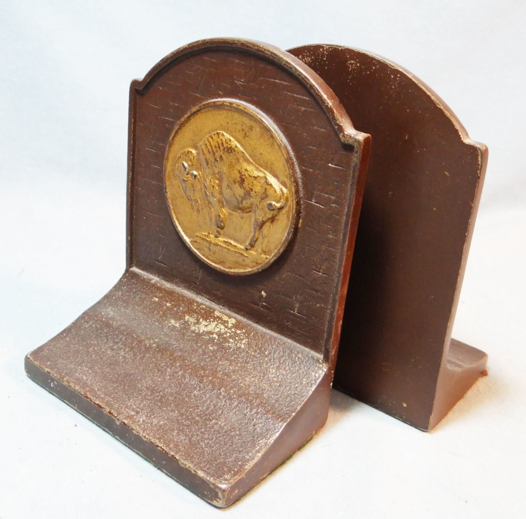 Cast iron buffalo bookends and metal Indian scout bookends, 6 ½" x 4" and 7" x 5"