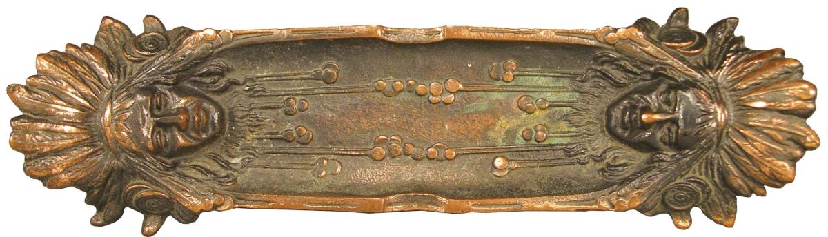 Cast iron copper flashed ashtray with indian motif. Excellent condition. 11 X 3 1/4 inches. Start Price $20