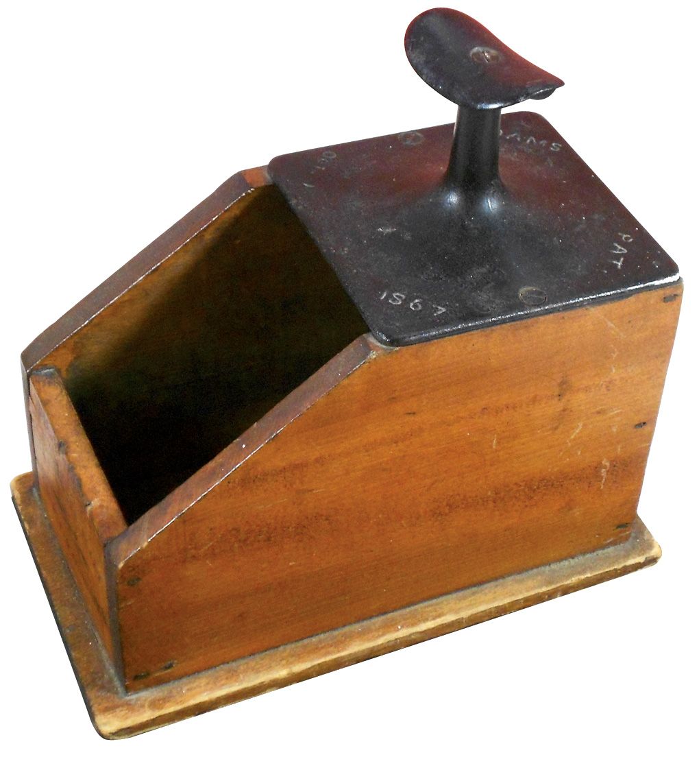 Cast iron foot rest, patd by Calvin Adams-Pittsburgh, PA on Oct 1, 1867, "a cheap & convenient foot-stander rest", concave iron rest mounted on wood box w/orig Pittsburgh Novelty Works stenciling, Exc cond, 9.5"H x 6"W x 20"D.