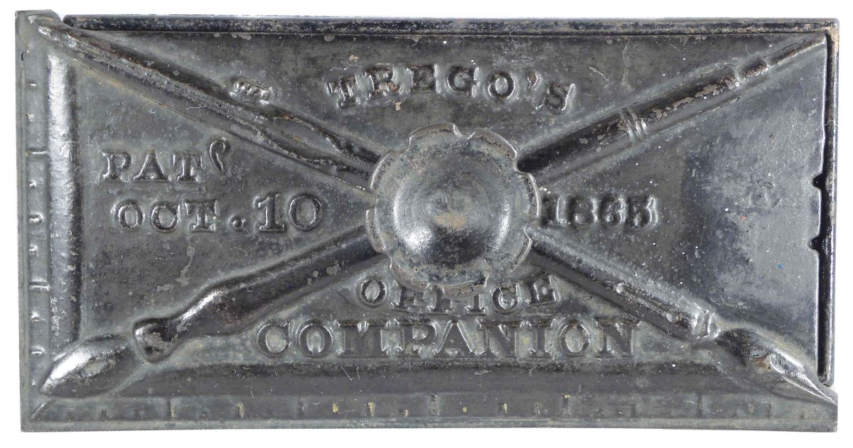 Cast iron ink blotter, advertising Trego's Office Companion, patented Oct 10, 1865. Excellent condition. 6 X 3 inches. Start Price $30