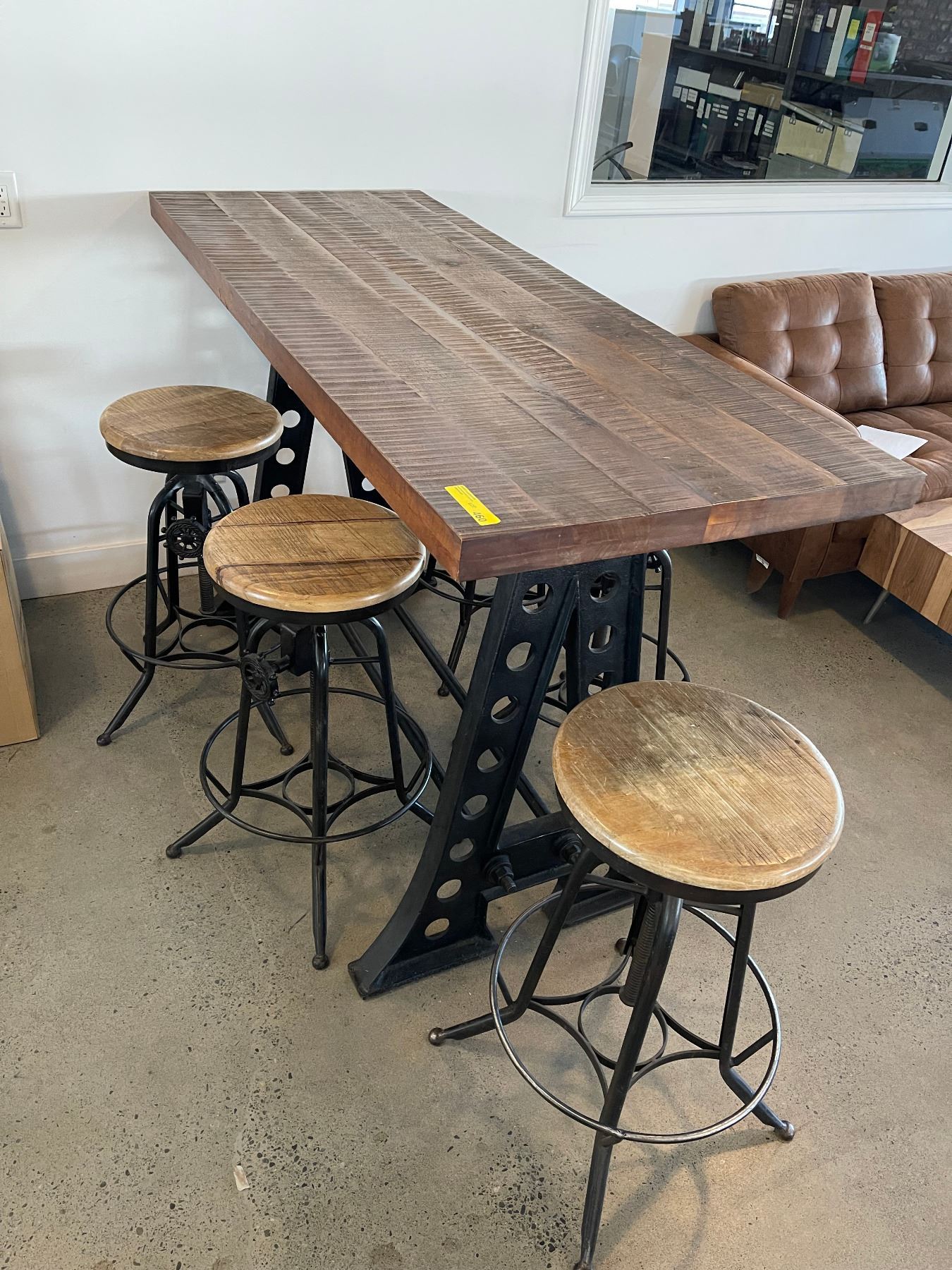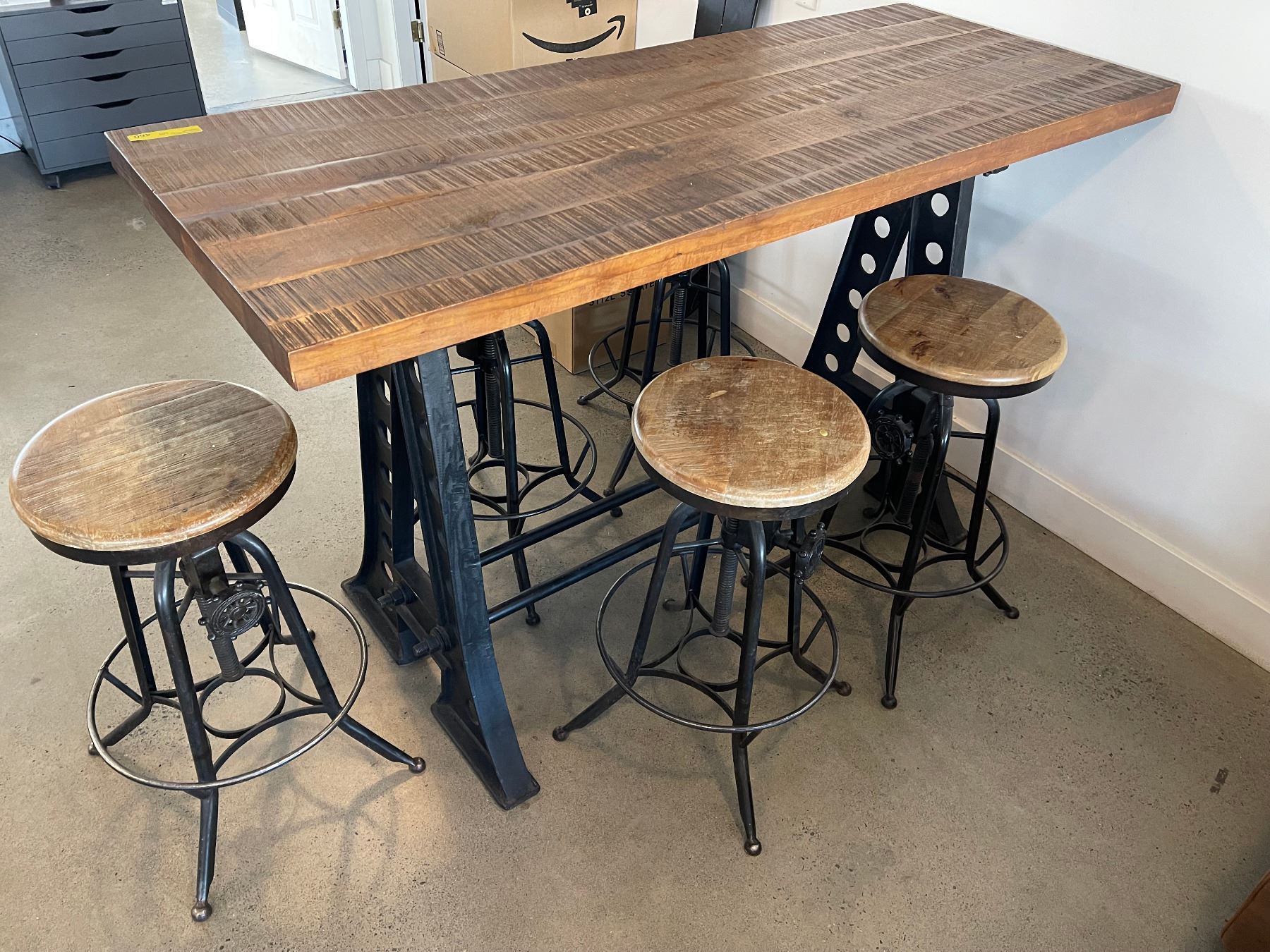 Cast iron + wood bar table (70in x 28in) & 5 crank adjustable stools