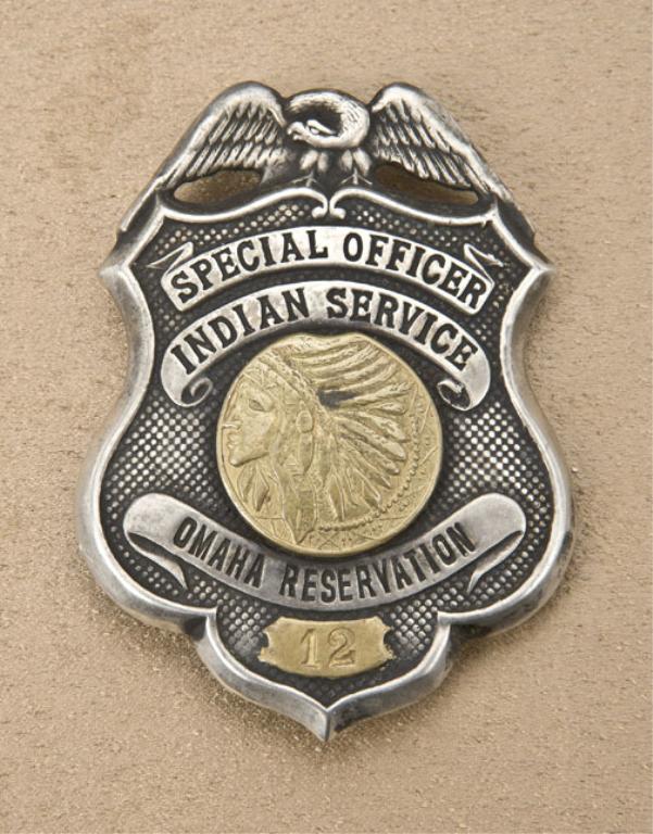 Cast metal Special Officer, Indian Service, Omaha Reservation shield badge with brass center piece with raised panel of Indian Chief in full feather headdress and brass ribbon at bottom of badge with the number 12. This badge is in overall very good condition showing some wear and a nice patina; the back side is stamped in small numerals “1889”; originally in the award-winning Gordon Matson Indian Police Servicecollection. Est.: $1,000-$3,000.