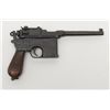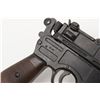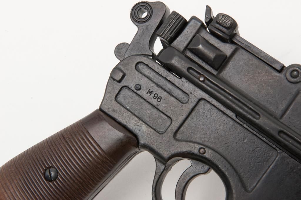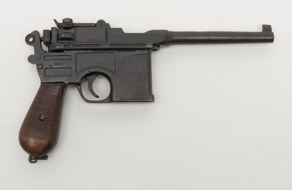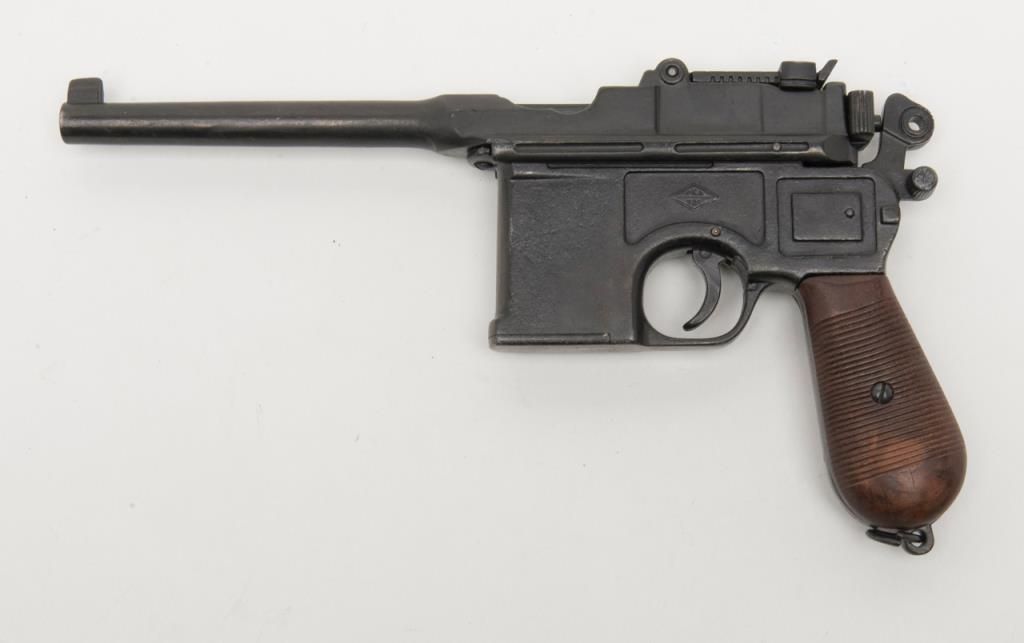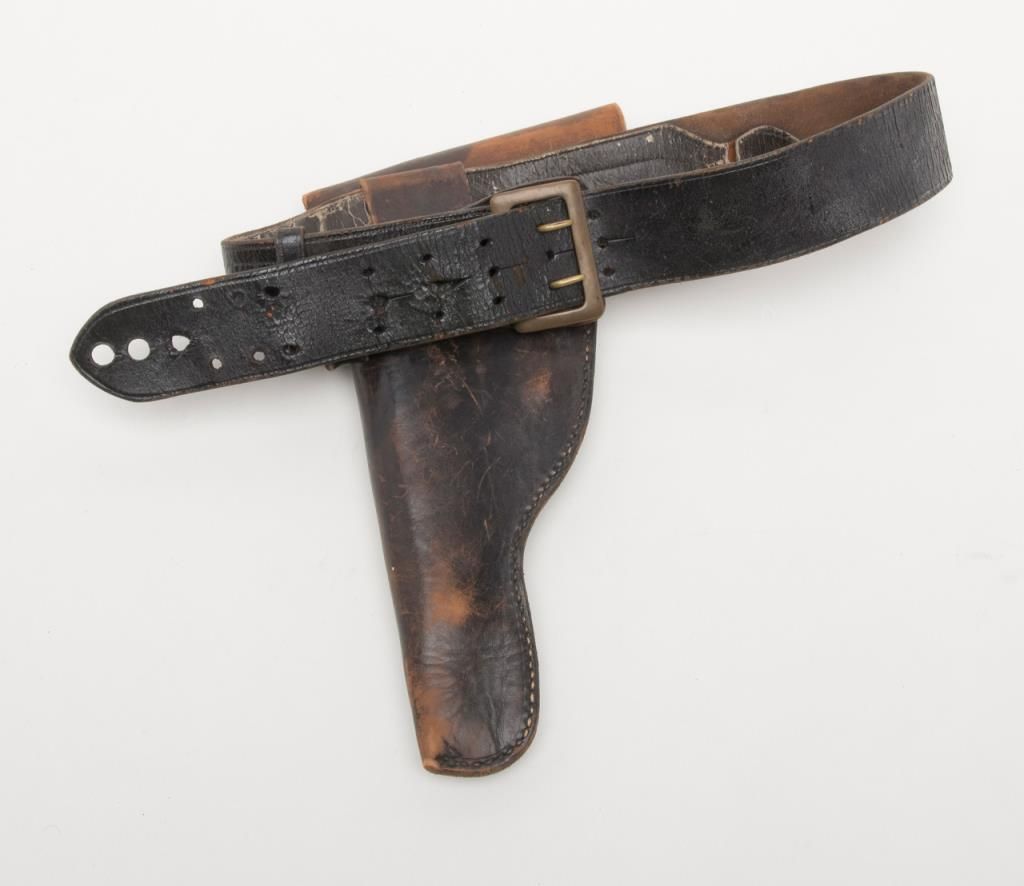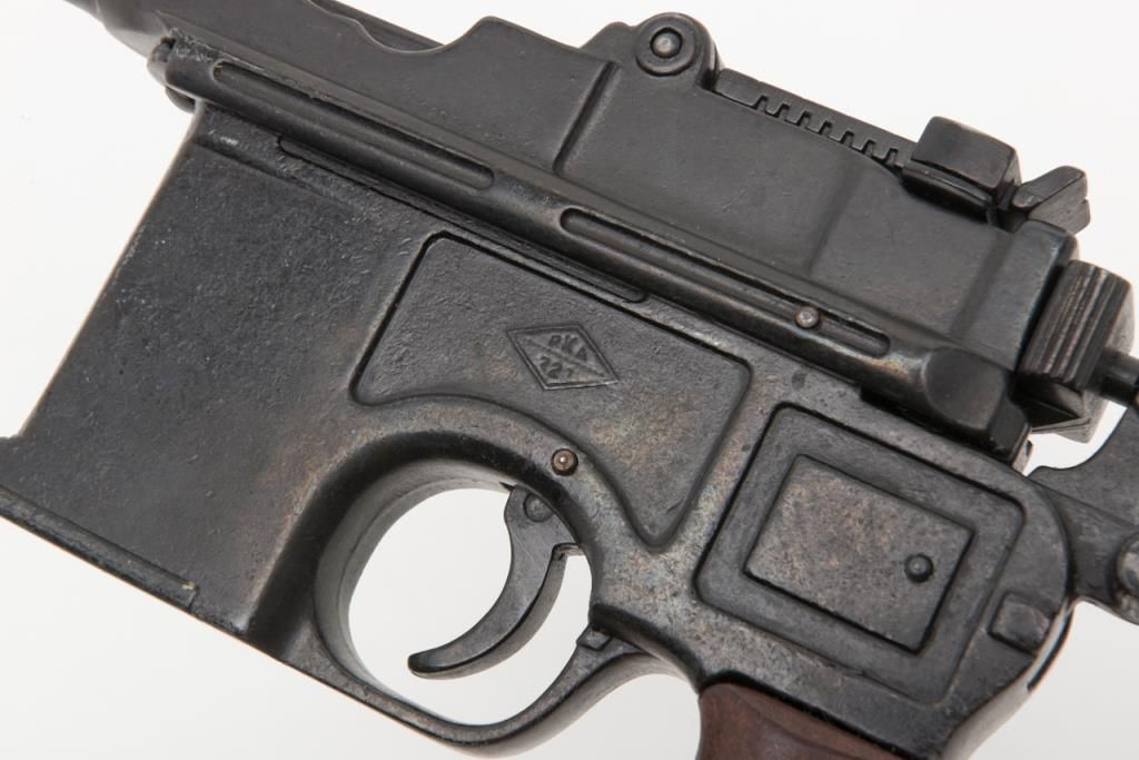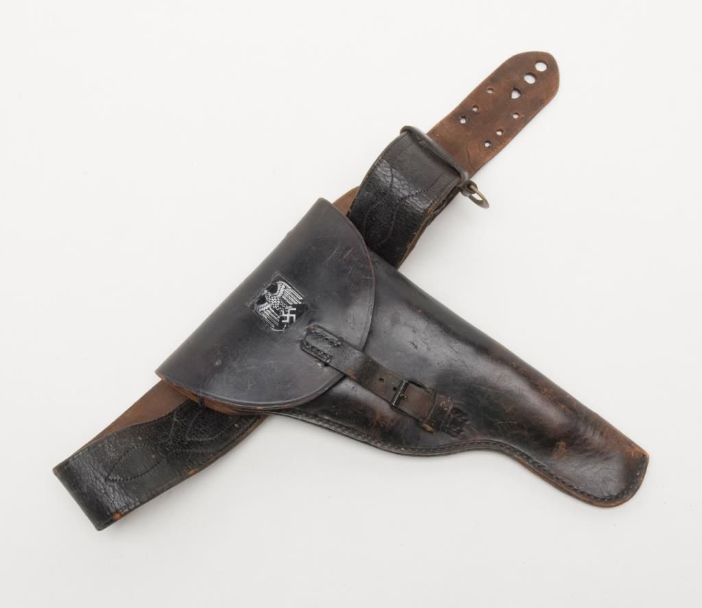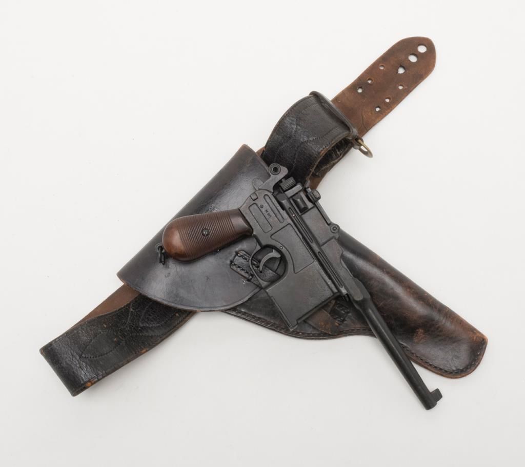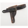 Cast metal model in style of Mauser broom handle with leather holster and belt showing a decal of swastika. A reenactors delight Est.: $100-$200