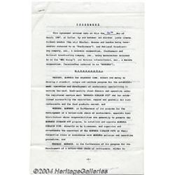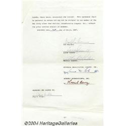 <B>Cast of Bonanza - Signed Agreement (1967).</B></I> A seventeen-page document, 8.5" x 13", dated 3/30/67, detailing an arrangement between Dan Blocker, Lorne Greene, Michael Landon, NBC, and the Bonanza Group regarding the management and promotion of the Bonanza Sirloin Pit chain of restaurants. Signed on the last page by Block, Greene and Landon, the document is in Fine condition. <I>Accompanied by COA from PSA/DNA. </B></I> <BR><BR><B>Important notice:</B> Heritage usually auctions material at the rate of 200-250 lots per hour. On some occasions eBay Live bid software or the Internet may not be able to keep up with the pace of the auction. We recommend placing a realistic absentee bid now as insurance to avoid disappointment. Occasionally the auctioneer may eliminate or reject an eBay Live bid, and the auctioneer may also reopen a lot after the close of the eBay live bidding (usually because we missed an audience bid), and may reject your bid even if it shows you as the winning bidder. By bidding via eBay Live, you agree that Heritage may award the lot to another bidder at its sole discretion under the circumstances described above or any other reasonable circumstances. Since eBay bids are not shown to us until we open the lot on the floor, we treat those bids just like floor bids. In most cases the floor responds before the eBay bid is presented to us, due to Internet lag time, so for consistency we have made it a policy that floor bids are always considered first over tie eBay live bids. Also please note that all Heritage lots purchased through eBay Live carry a 24.5% Buyer's Premium. Please make sure you read the Terms and Conditions before you bid.