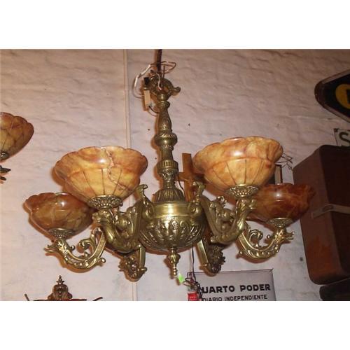 <tr><td>Title:Casted bronze chandelier with six alabaster</td></tr>