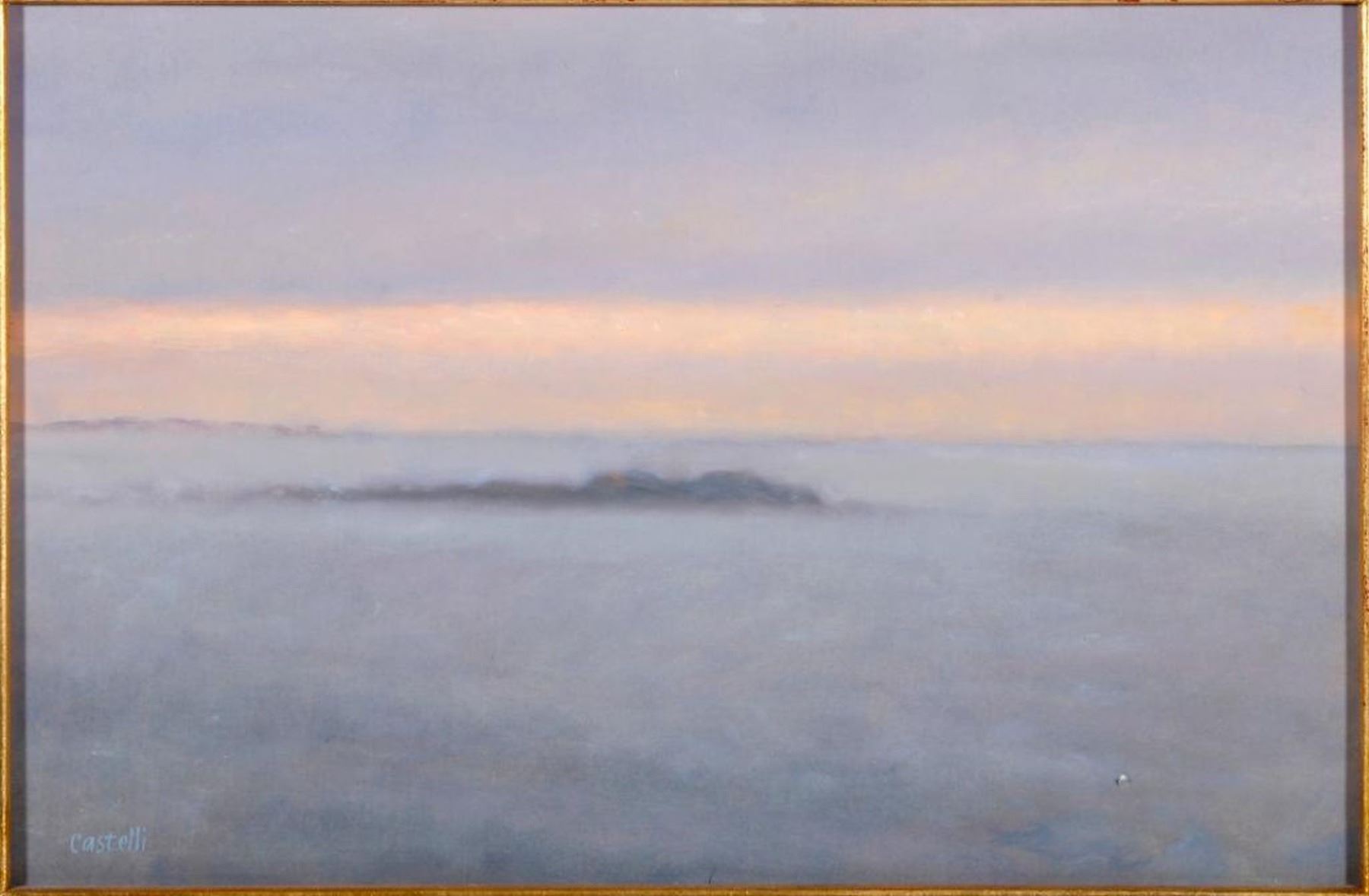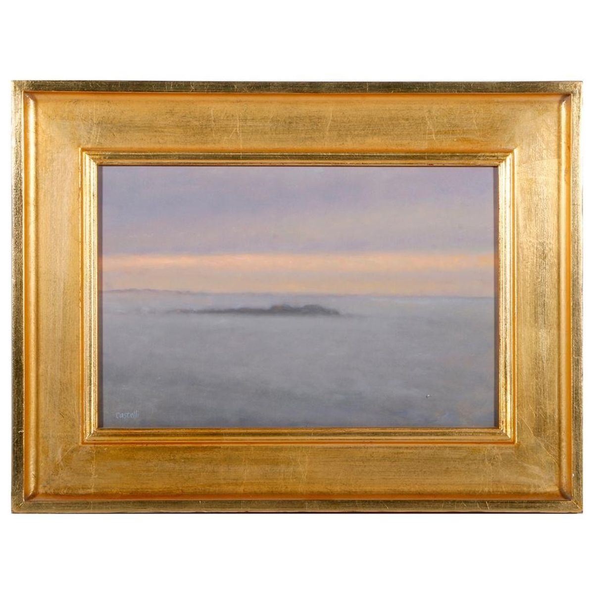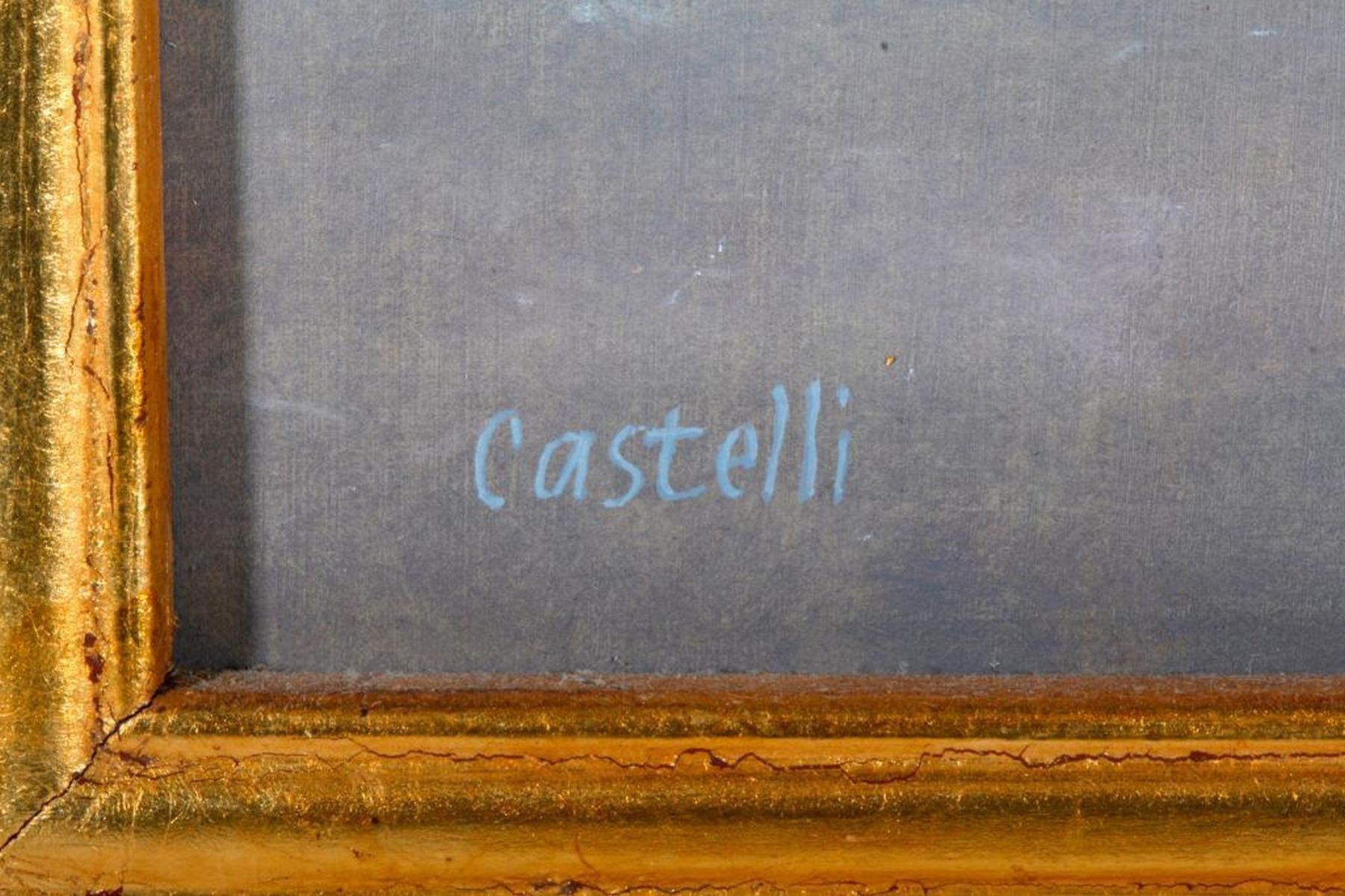 Artist: Castelli. Title/Subject: Seascape. Signature: Lower right. Medium: Oil on board. Size image: H - 8" W - 12". Size frame: H - 12 1/2" x 16 1/2". Created: 20th / 21st century. Condition: Good, small paint chip.