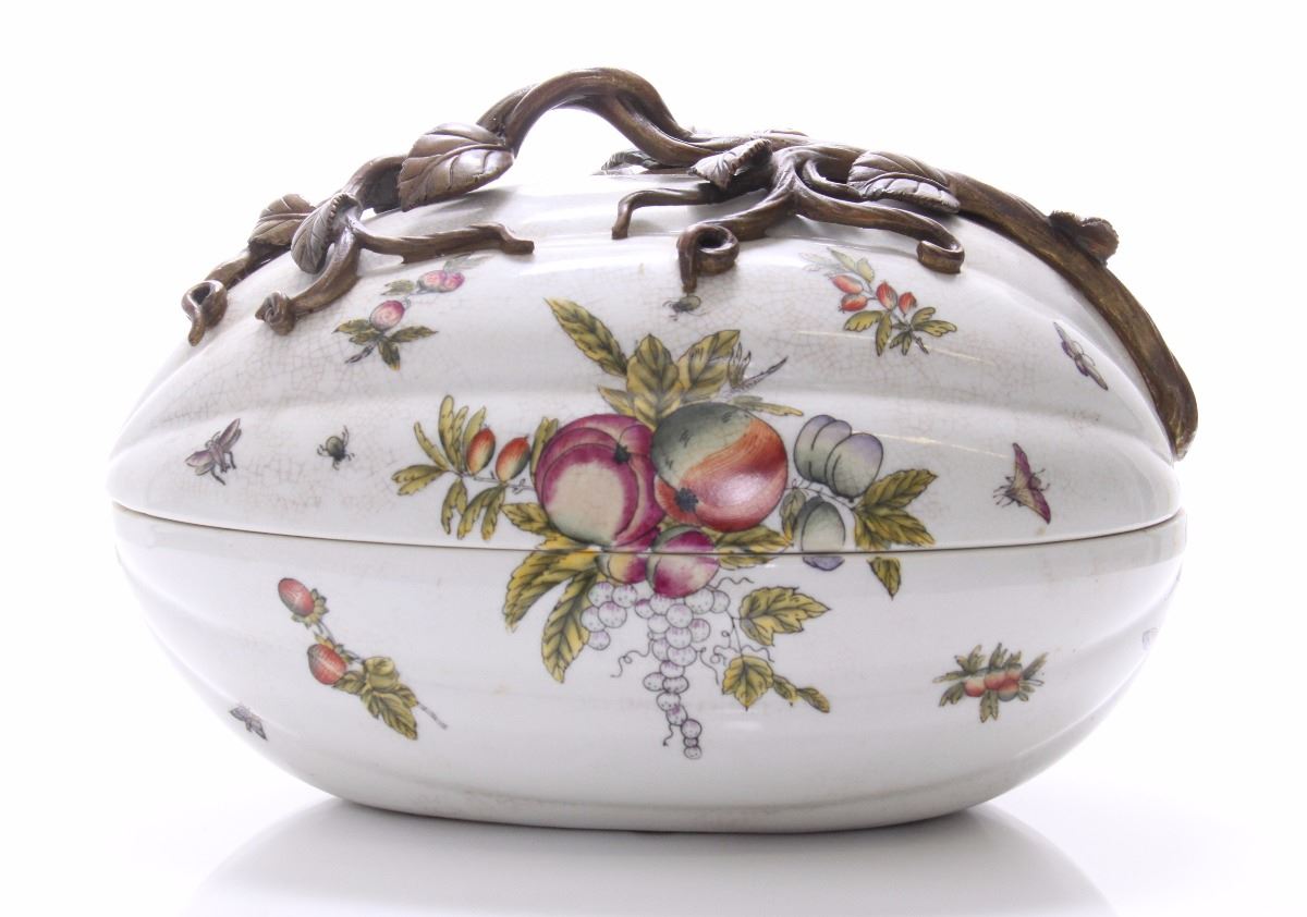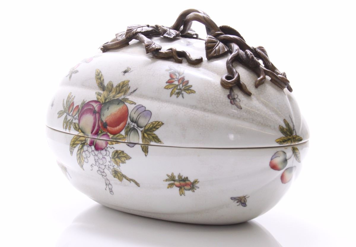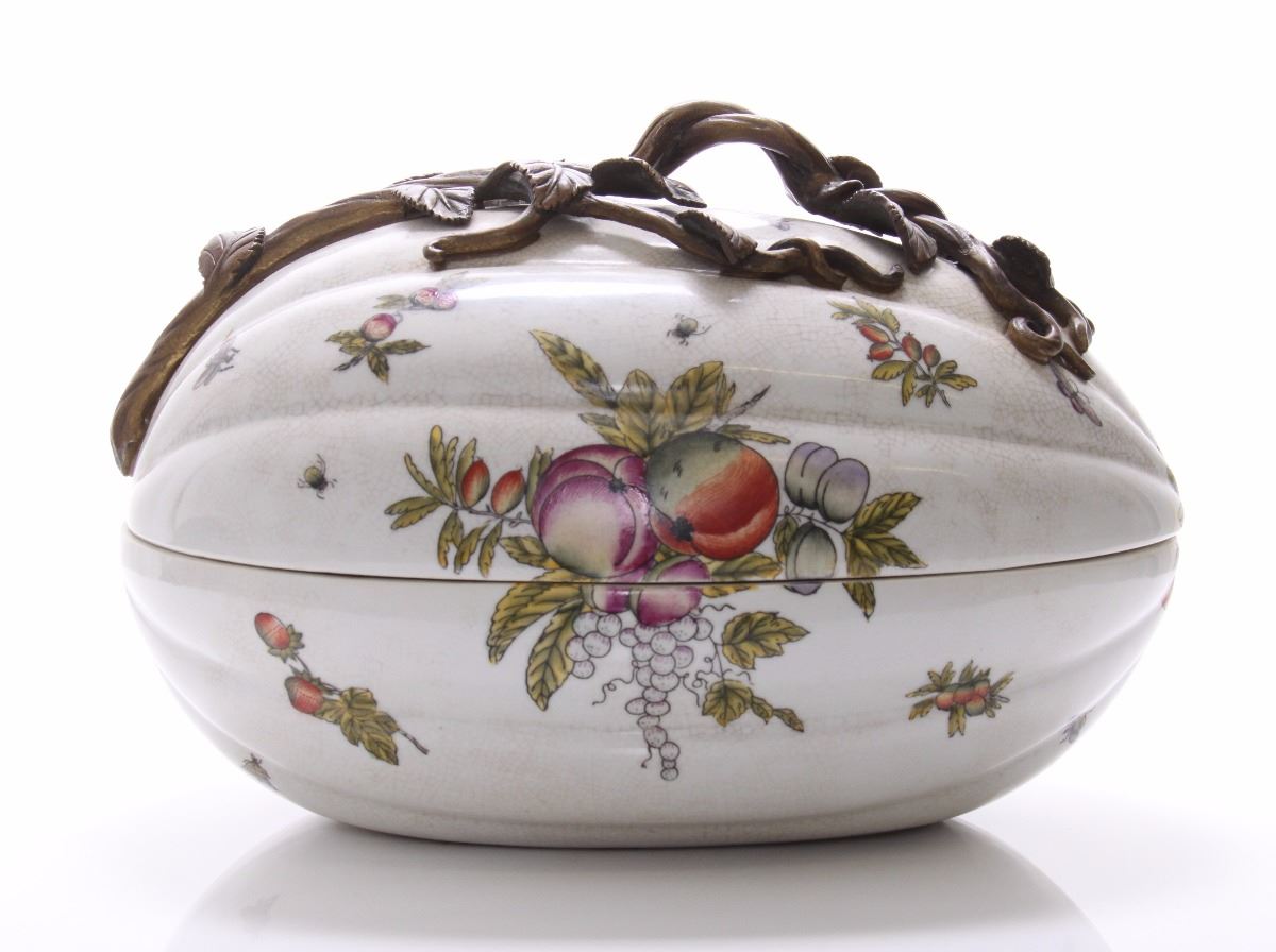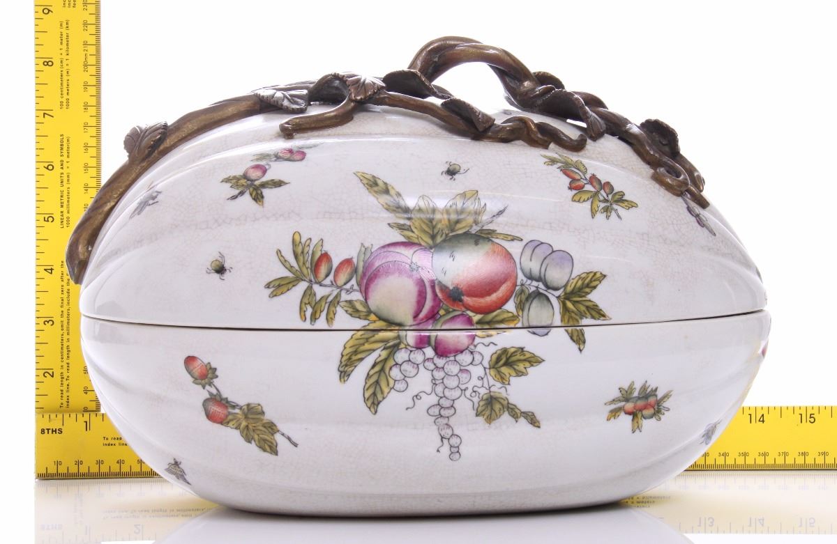 Castilian made bronze and porcelain egg shaped container. Estimated more than 50 yrs old. (Pangaea Auctions) Size: See Ruler Photo. (Photos Represent The Condition Of The Lot.)