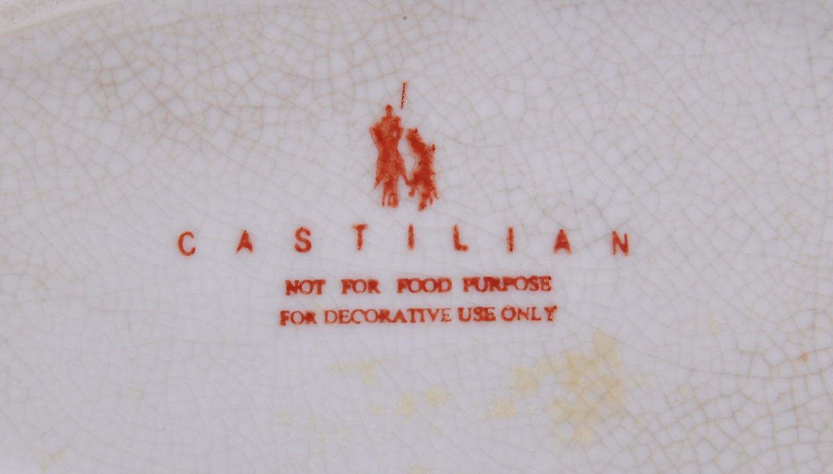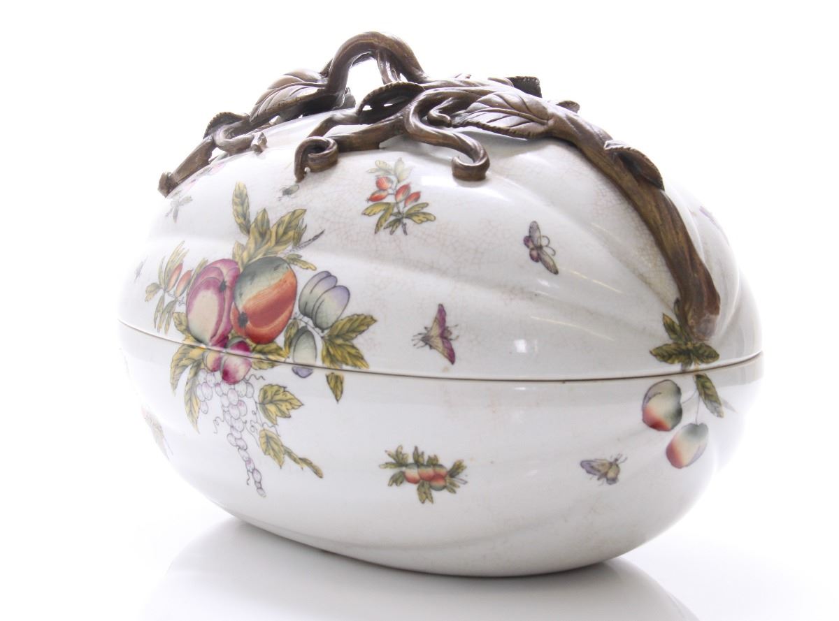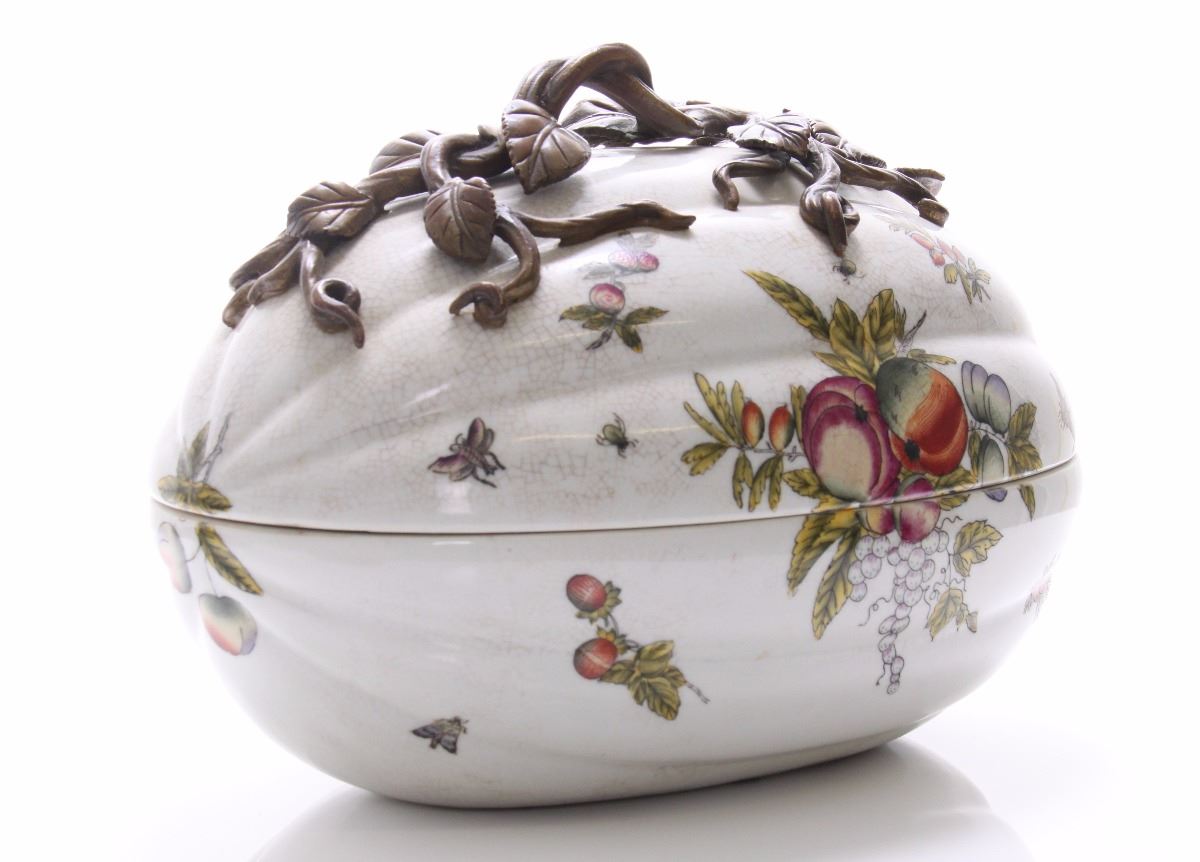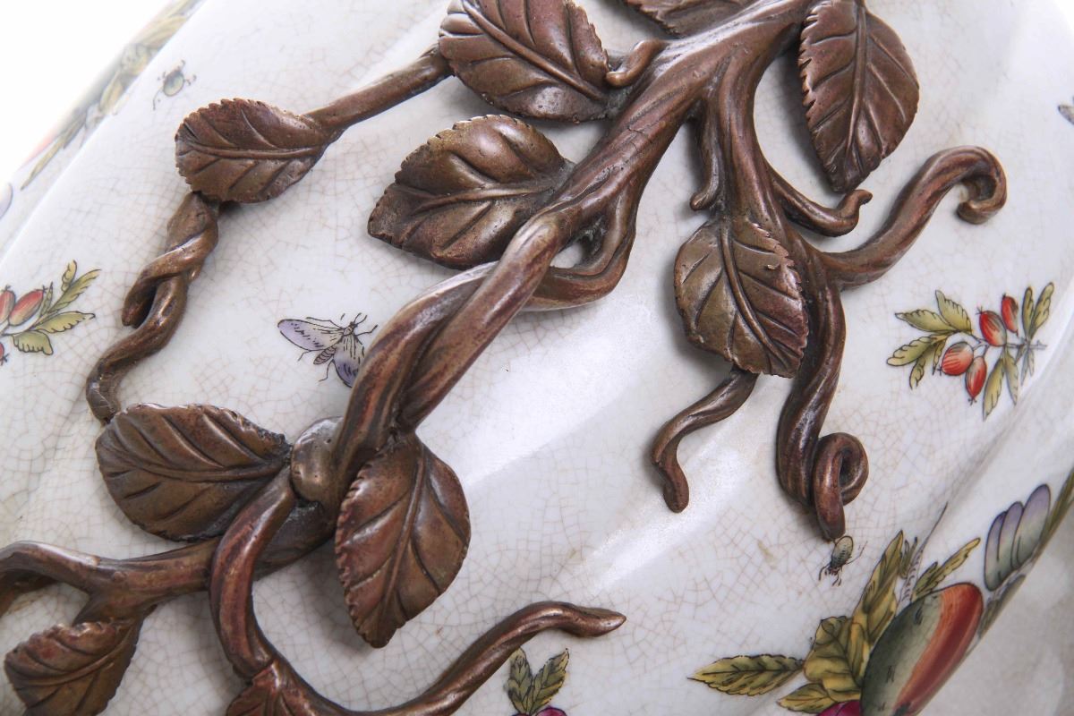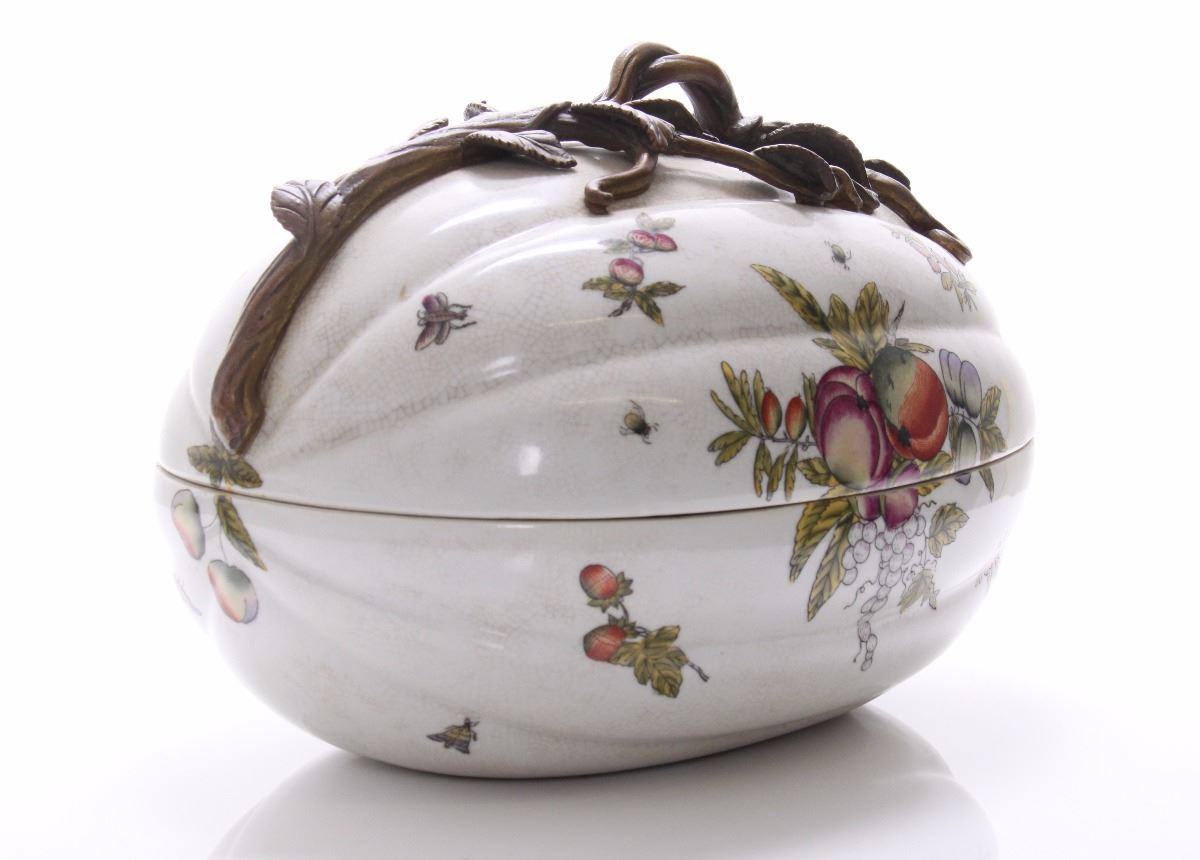 Castilian made bronze and porcelain egg shaped container. Estimated more than 50 yrs old. (Pangaea Auctions) Size: See Ruler Photo. (Photos Represent The Condition Of The Lot.)