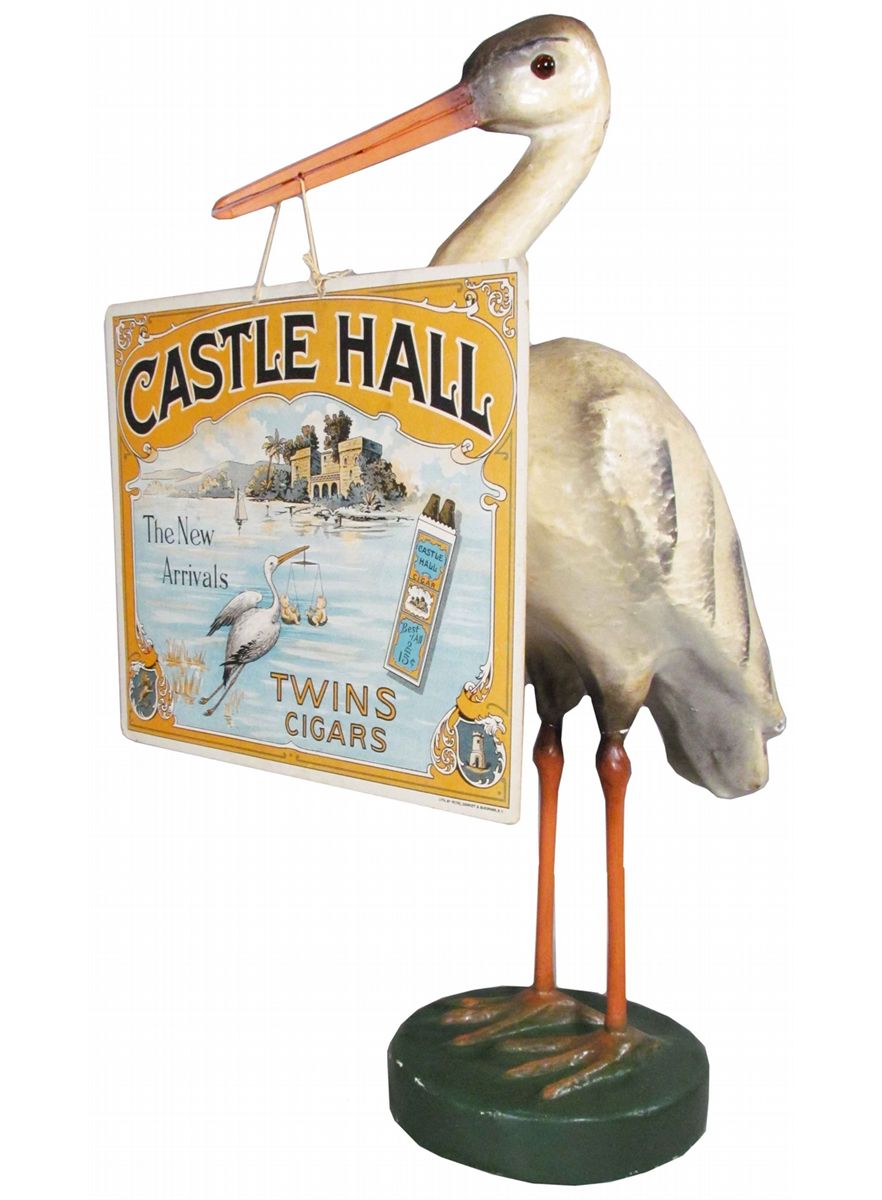 Castle Hall Twin Cigars Paper Mache Stork with string hanger sign. Repairs on legs and base otherwise very good condition. Stork measures 25 inches tall.