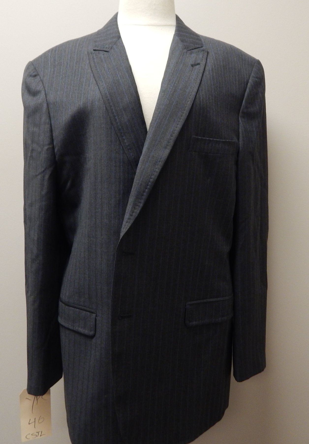 Custom made DeStefano gray and blue striped blazer screen worn by Nathan Fillion in the series Castle. All items come with a certificate of authenticity good for the life of the piece.