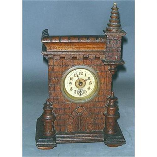 Small oak Black Forest castle clock with alarm probably 1900 in good working order