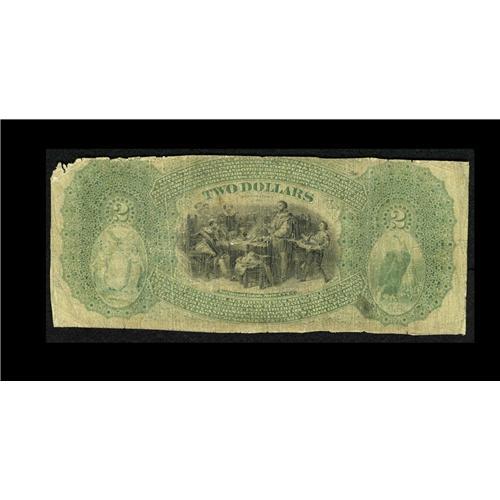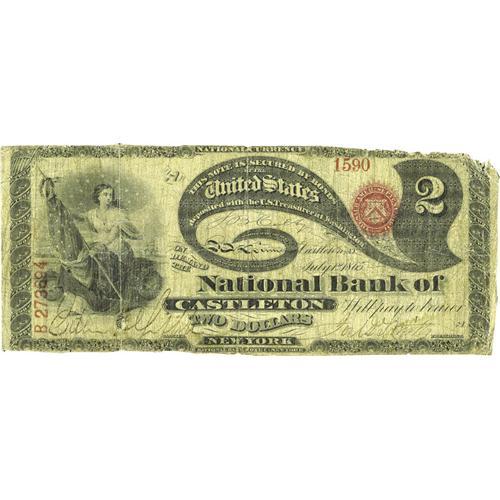 <B>Castleton, NY</B></I> - $2 Original Fr. 387 <B>The NB of Castleton</B></I> Ch. # 842<BR>This is the only Deuce known from this very scarce bank, which issued First Charters and Brown Backs only before liquidating in 1901. The note shows plenty of circulation and displays a few minor flaws, but the colors are bold and the appearance more than acceptable. <B>Very Good.</B></I>