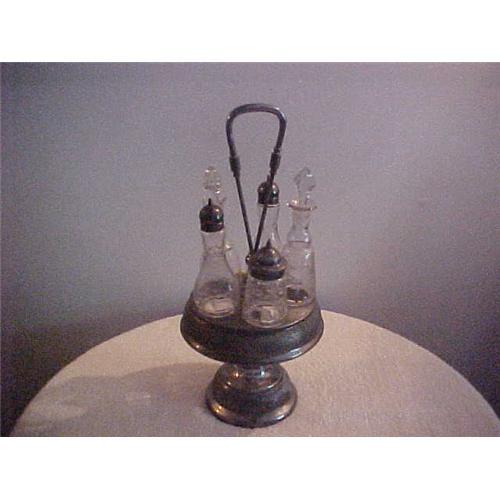 Castor Set, 5 Etched bottles, silverplate base, needs polishing