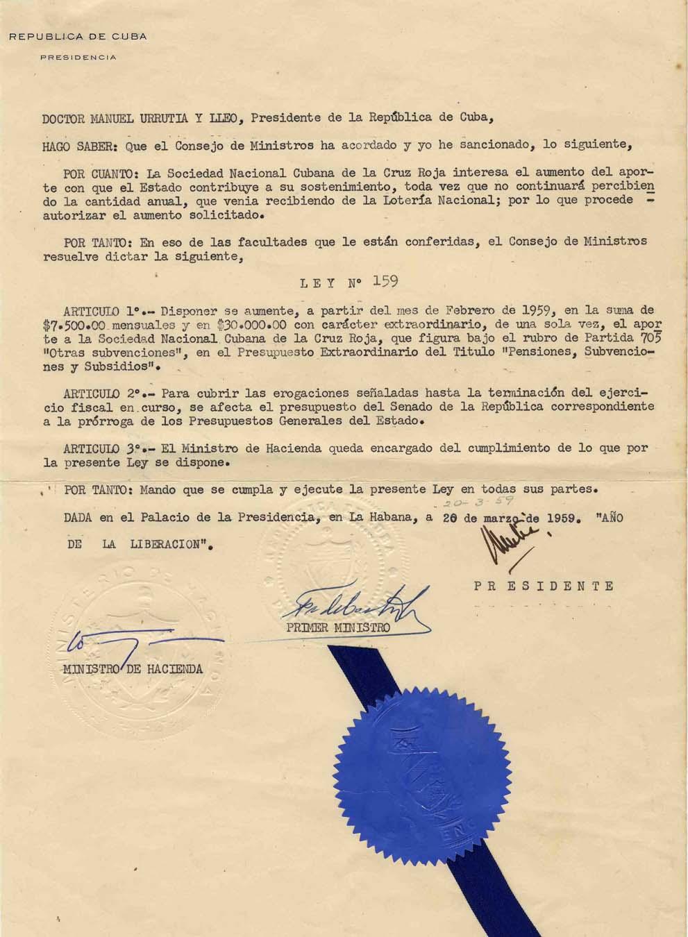 Extremely rare document signed by both Fidel Castro as Cuba's Prime Minister, and Manuel Urrutia as the its 20th President (and the first post-republican President). The short six month period of Urrutia's Presidency makes this document truly rare and significant. 8.25'' x 11.25'' document dated 20 March 1959 complete with ''Republica de Cuba / Presidencia'' letterhead, blue seal and two blindstamped seals of the Republica de Cuba and the Ministerio de Hacienda. In near fine condition with only one fold and light wear along right edge.
