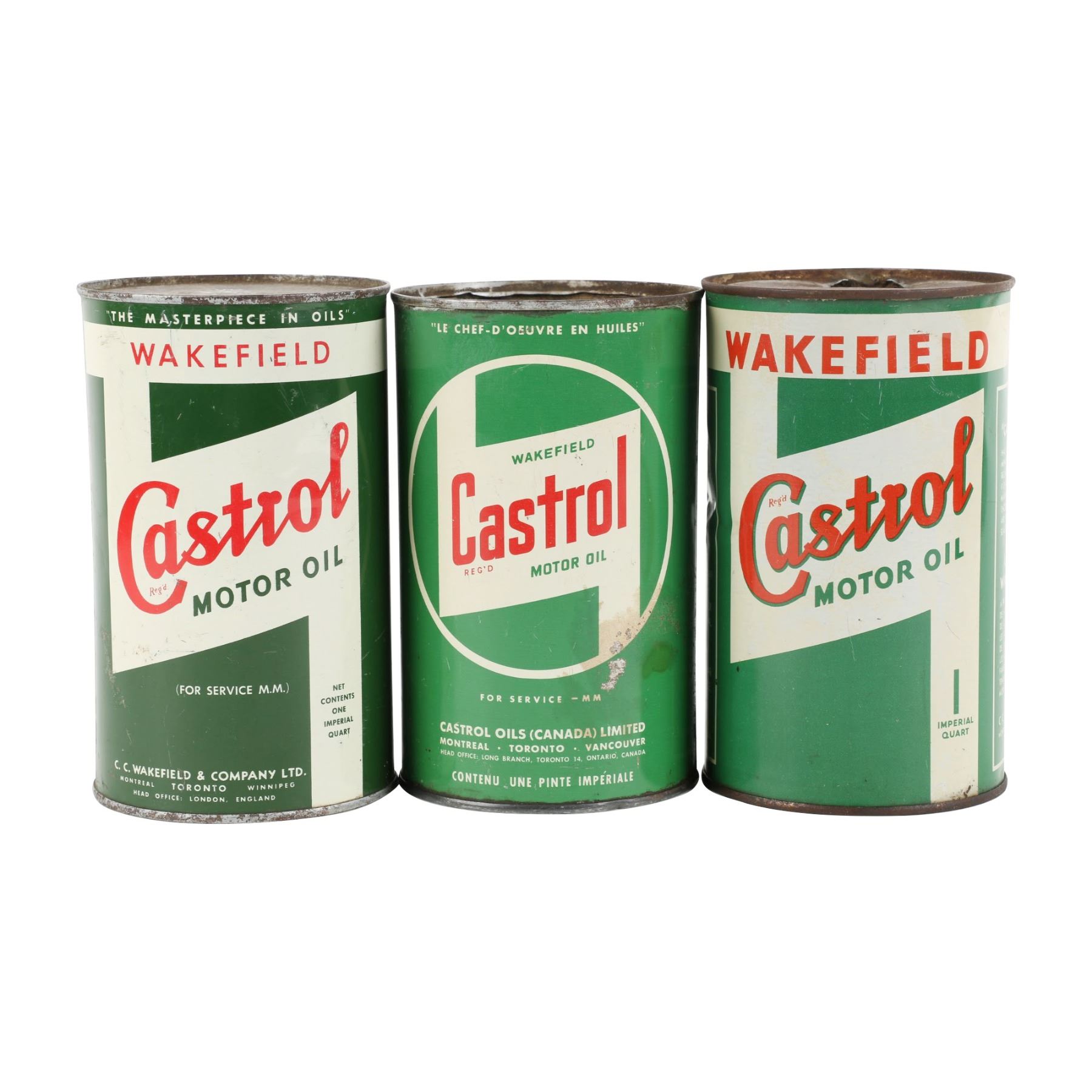 Three (3). Canadian. One (1) Imperial quart. Oxidation, scattered impressions, surface loss. One top removed, two with pierced lids. $50-100.