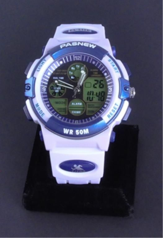Casual Men's Diving Sports Watch With Sports Multi-functional Dual Display. White Heavy Duty Ivory Colored Rubber Band. Watch Has A Digital Display Of Date And Time. The Watch Is Water Proof To 50 Meters. Movement Is Digital.