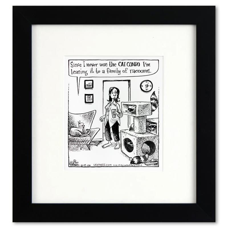 Enter a surreal and satirical world of twisted imagination and award winning creativity. "Cat Condo" is an original pen & ink drawing on paper by Dan Piraro, creator of the critically acclaimed and award winning comic strip, Bizarro. This piece is hand signed, comes custom framed and includes a letter of authenticity. Measures approximately 12" x 11" (frame), 7" x 6" (image). This item requires special handling and may have a longer than usual turnaround.