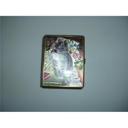 This pretty box has cobalt glass around the sides, brass fittings, a mirrored interior bottom which is divided. The image of the cat is wonderful, as are the bun feet. The measurements are 4-1/4" by 3-1/2".