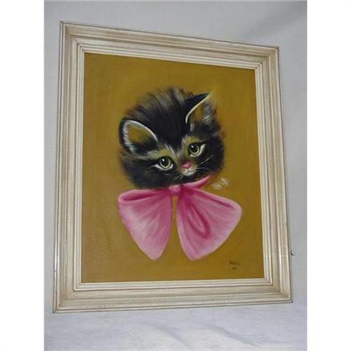 Framed oil painting, 29'' X 25'' of a kitten with green eyes and wearing a large pink bow around it's neck. Signed A katz 64. Slight dent in canvas upper left.