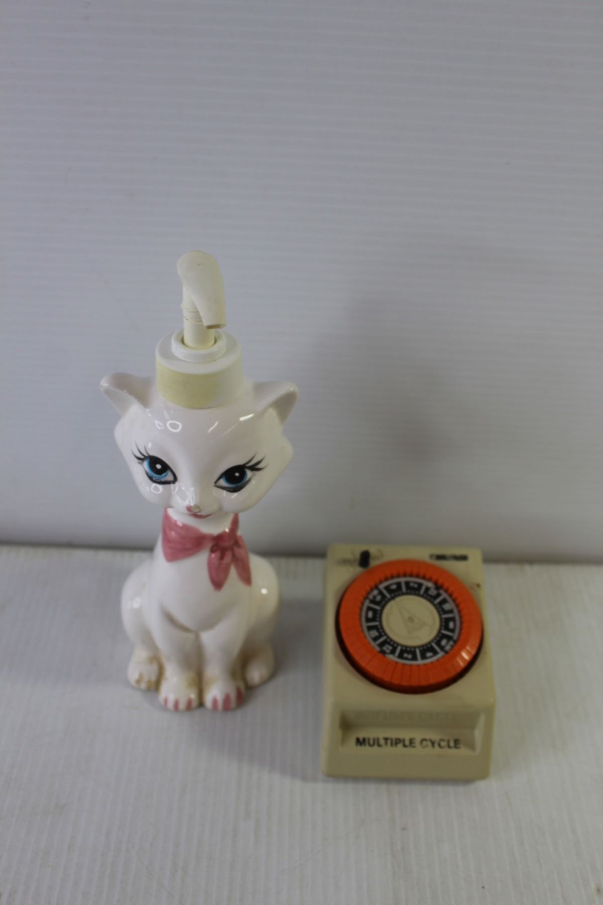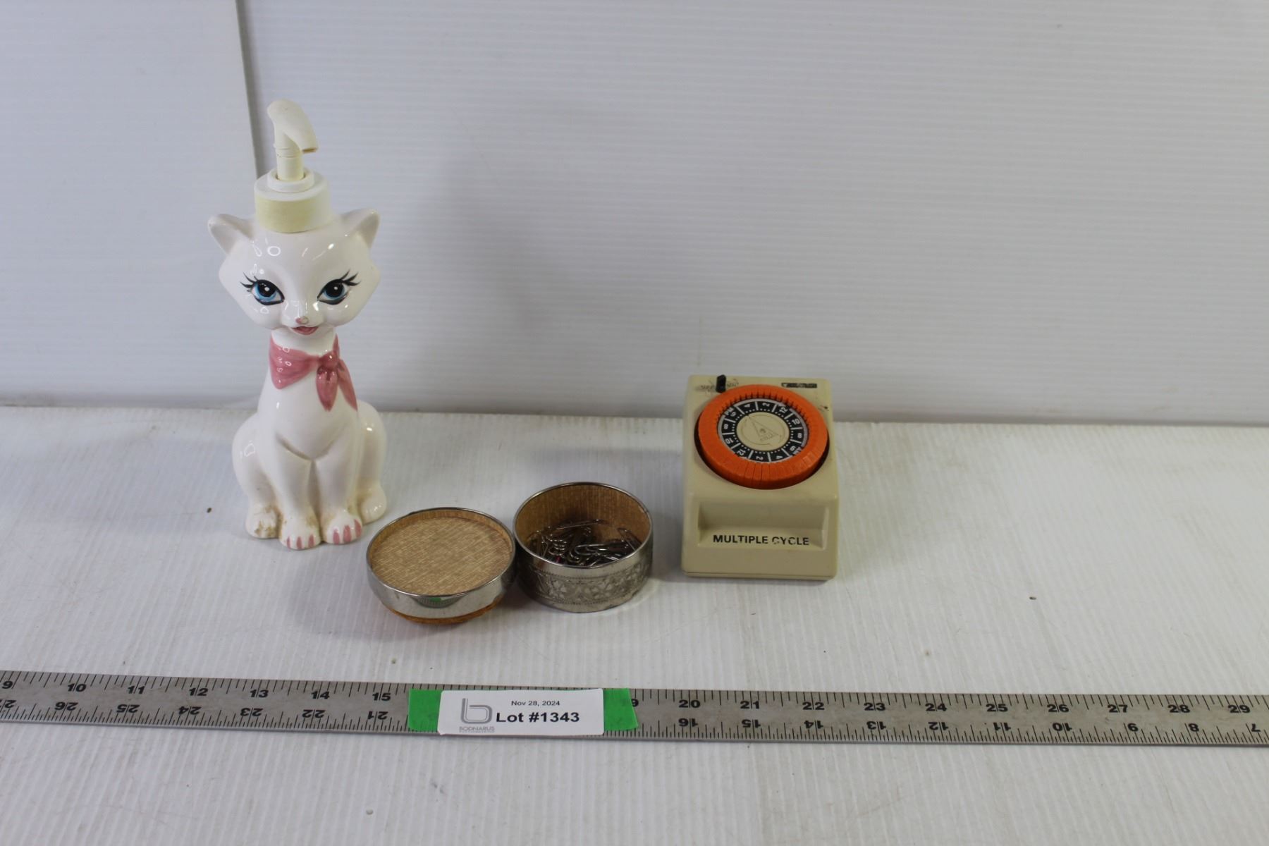 Cat Soap Dispenser, Vintage Timer, Tin of Paper Clips