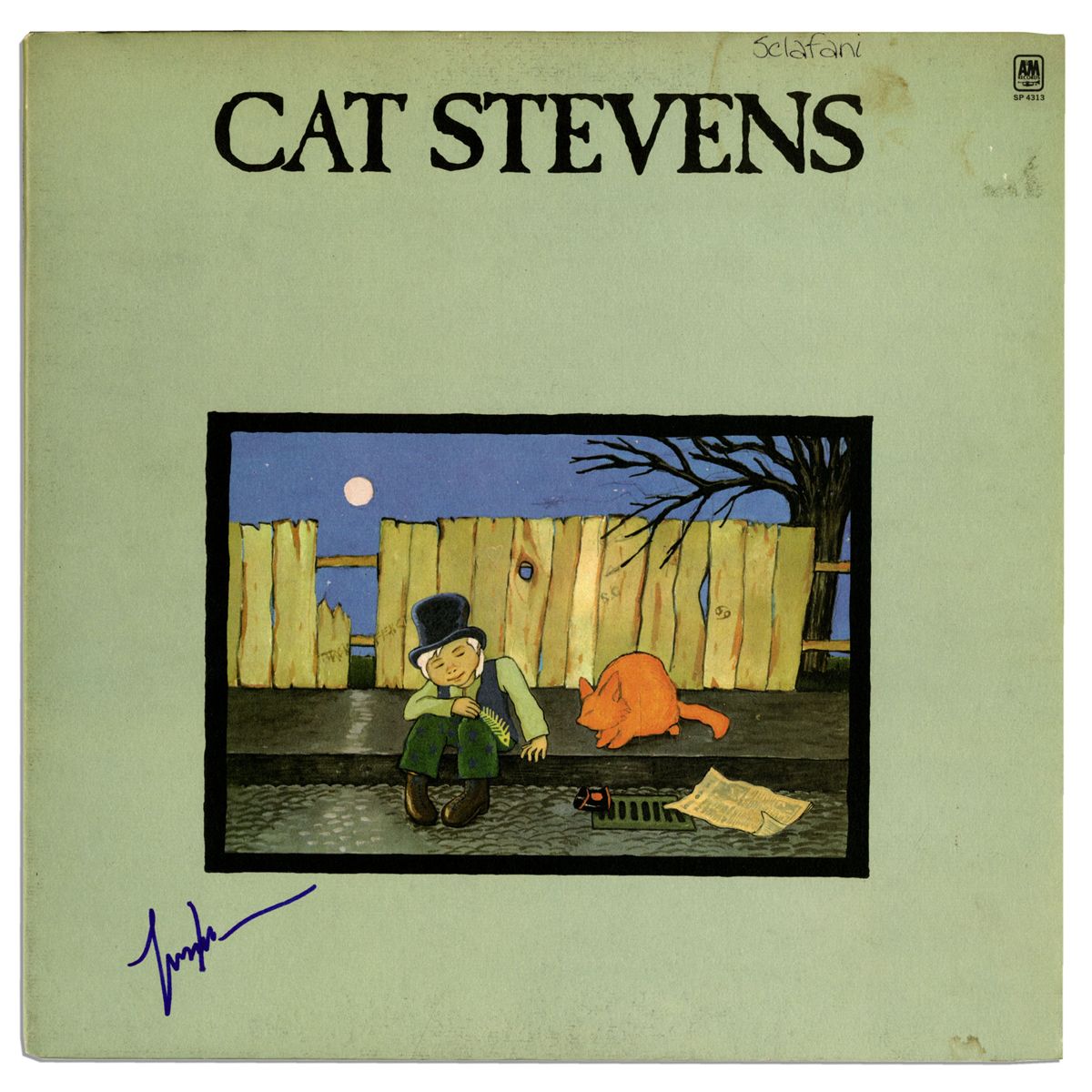Cat Stevens signed ''Teaser and the Firecat'' record, produced by Irving Music, Inc. - BMI. Stevens uses a blue felt tip to autograph the lower left of the front cover using his Muslim name, ''Yusuf''. This 1971 album contains such hits as ''Moonshadow,'' ''Morning Has Broken'' and ''Peace Train.'' Minor surface loss to edges, pen notation to top edge, scattered light staining and adhesive remnant to front cover, else near fine. From Mike Wehrmann.