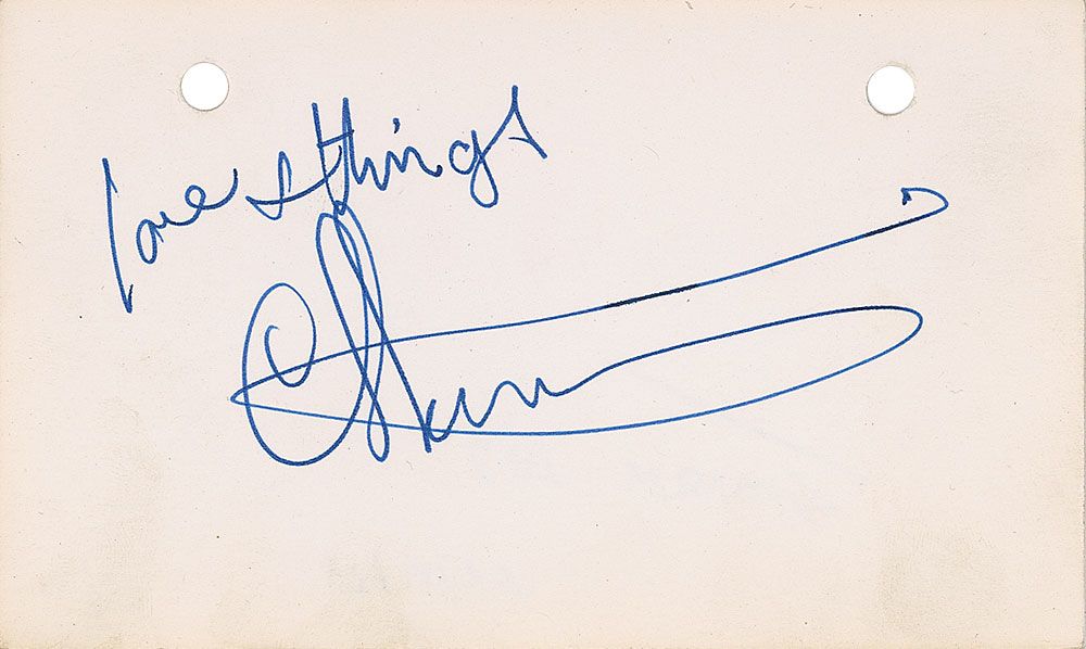 Uncommon ballpoint signature, “Love & things, Cat Stevens,” on an off-white 5 x 3 card. Collector’s notation on reverse indicates signature was acquired on November 11, 1975. In fine condition.