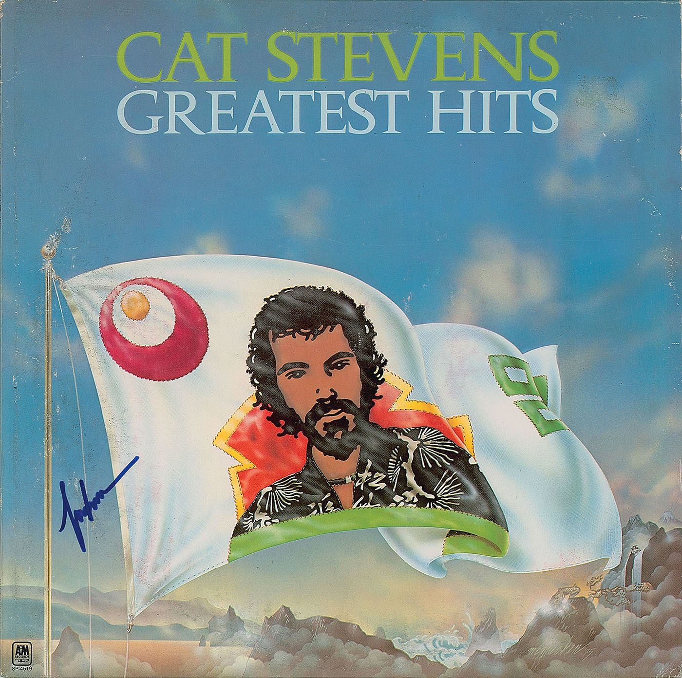 Greatest Hits album signed on the front cover in blue felt tip by Stevens as Yusuf Islam. In fine condition, with light scuffing and old price sticker residue. The record is included.