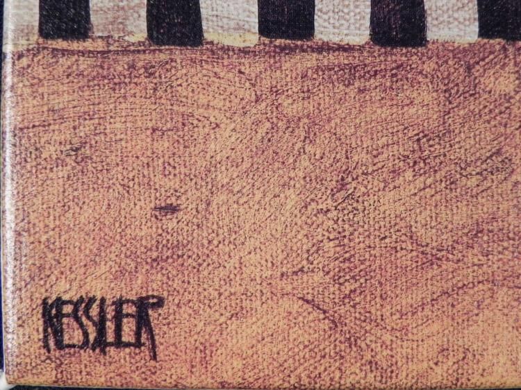 This big white cat has a charming, na ve quality in its form. br> * * Title: "Cat with Purple Ball" * * Artist: Daniel Kessler * * Medium: Lithograph print on canvas: stretched on boardSize: 12 1/2" x 16"Condition: Excellent * Biography: * * Daniel Patrick Kessler's artistic roots began in Catholic grammar school, * where nuns gave him holy cards-bright, ornate depictions of religious scenes-which caught his eye and fired his imagination. After receiving a Bachelor's degree in Science from the University of Maryland, Kessler worked for several years in graphic arts and * architectural design before turning to painting full time in 1991. Among his major influences are modern artists Joseph Cornell, Man Ray, Robert Rauschenberg, and Gregory Gillespie; the 17th century Dutch masters; and the Italian Renaissance painters. * * * Today, Kessler's distinctive renderings of the Texas state flag, of a sheepish, brightly colored Red dog with an apple on it's head, known as William Tell's dog, and of 19th * century Washington homes have become a staple of his oeuvre; as recognizable in their own way as Andy Warhol's soup cans or Matisse's cutouts. Kessler's architectural pieces include five commissioned Presidential commemorative paintings of The White House; * and a folk art rendition of the White House used by President Clinton and the First Lady for a 1996 Christmas card. * * * * * Kessler's work can be found in corporate and private collections internationally, and his reproductions are available worldwide. His work is also on display and available most weekends at the historic Eastern Market in Washington, D.C. *