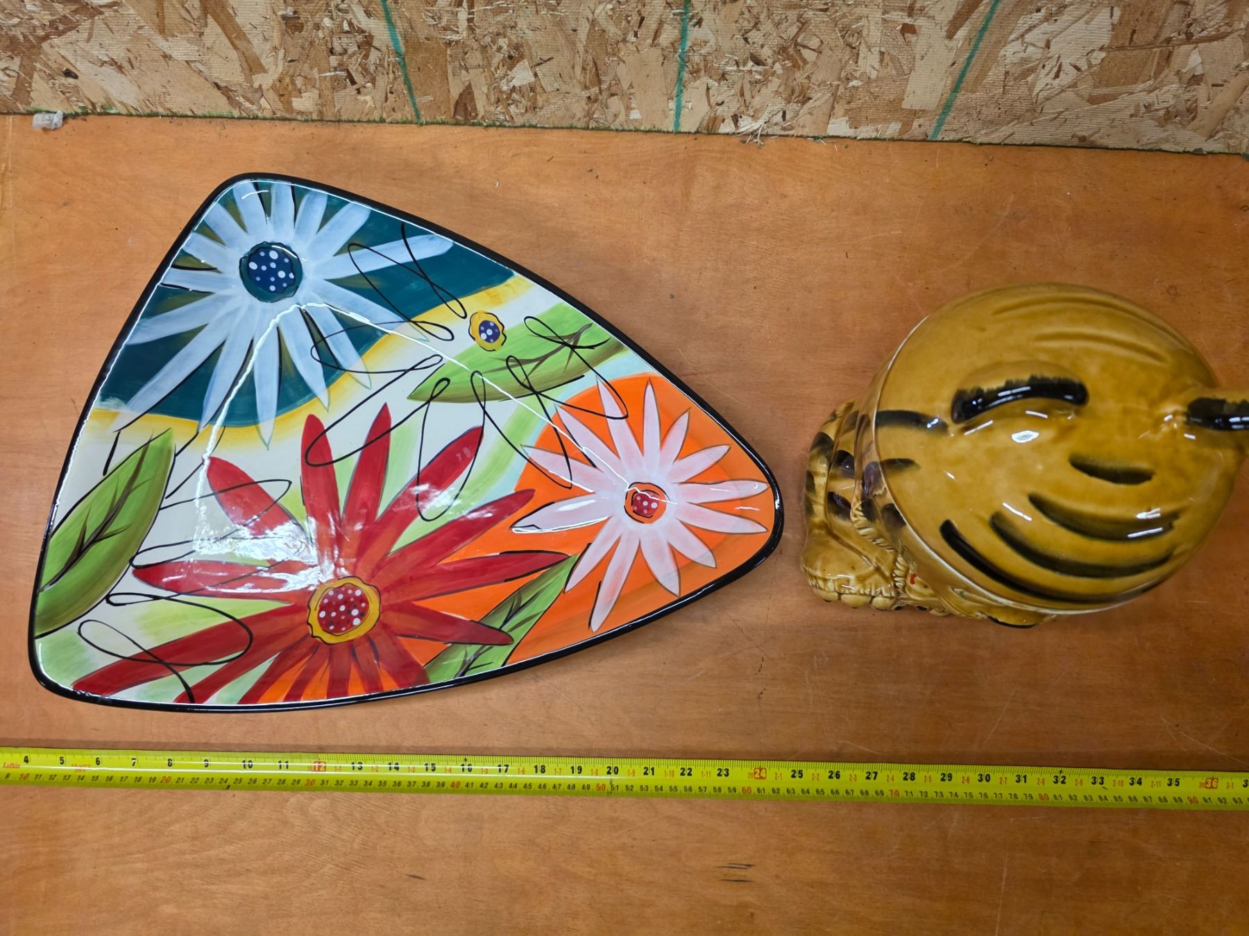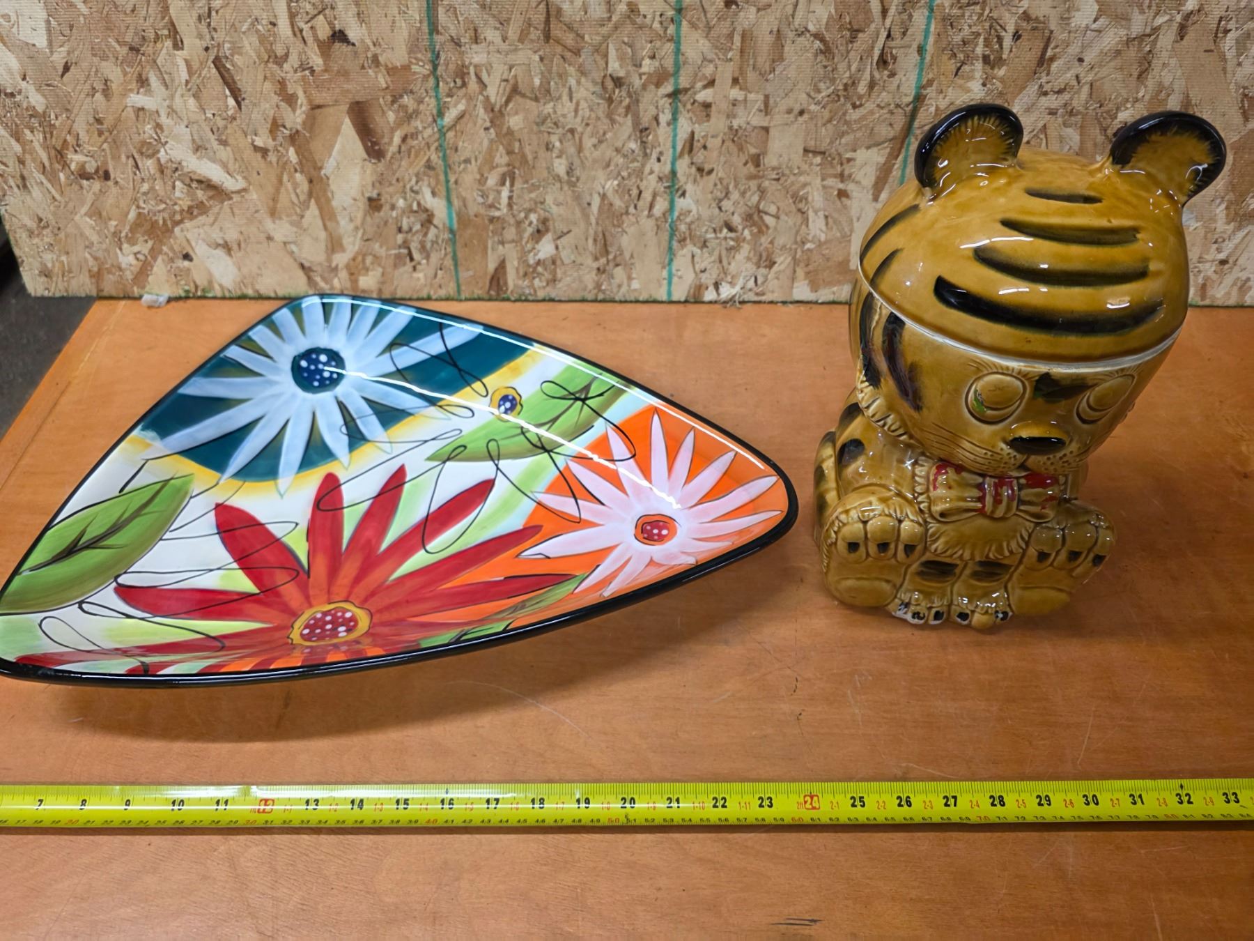 Cat cookie jar, clay flower decore plate