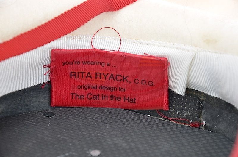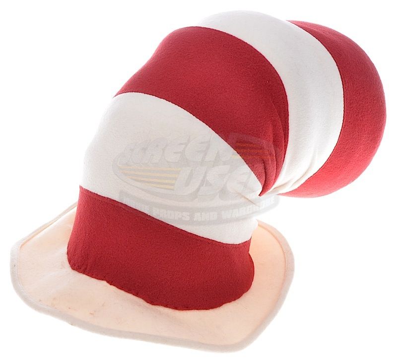 (Universal Pictures, 2003) This cat suit and hat were custom-made by the production for use by Mike Myers and his stunt person as "The Cat in the Hat". The suit represents the essence of the iconic "Cat in the Hat" look. It includes the custom fur-covered cowl with an open face, cat shoes which attach to the ankles of the suit by concealed buttons, foam cat ears, and the very iconic red and white striped hat. This style hate, nicknamed "Sad Hat", can be seen in several scenes of the film; however, this hat was made for the production and not used during filming.