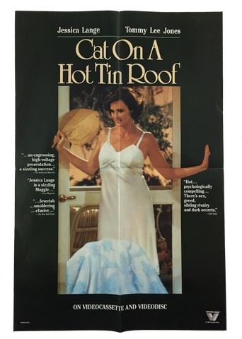 Cat on a Hot Tin Roof (Vestron Video, 1985). One Sheet. Starring: Jessica Lange and Tommy Lee Jones. There are fold lines and creases. Very Fine. (24" X 36").