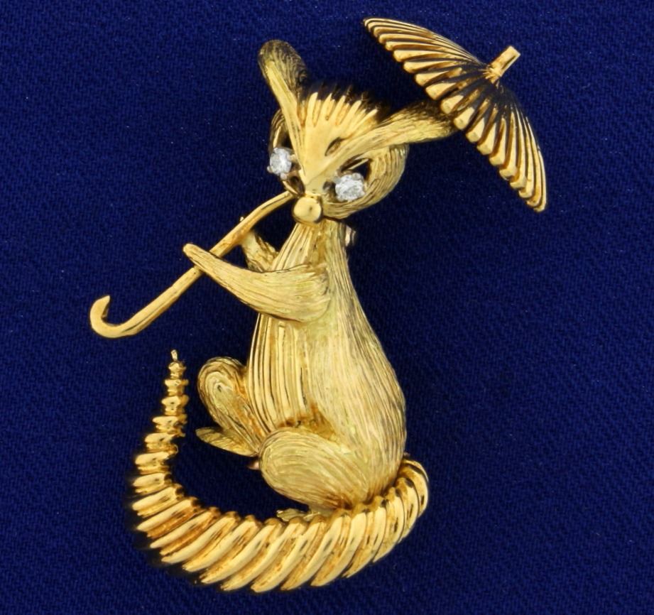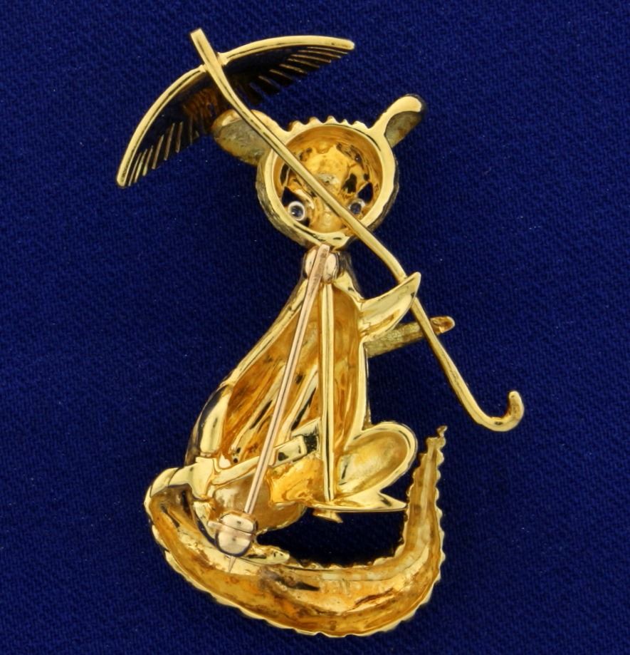 In 18k yellow gold. Contains two .02ct high quality diamonds for eyes with a VS clarity/G color. Head turns when you move the tail. 1 3/4 inches long. 15.6g.
