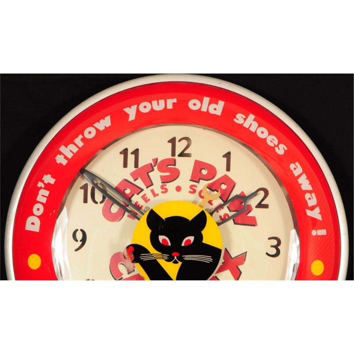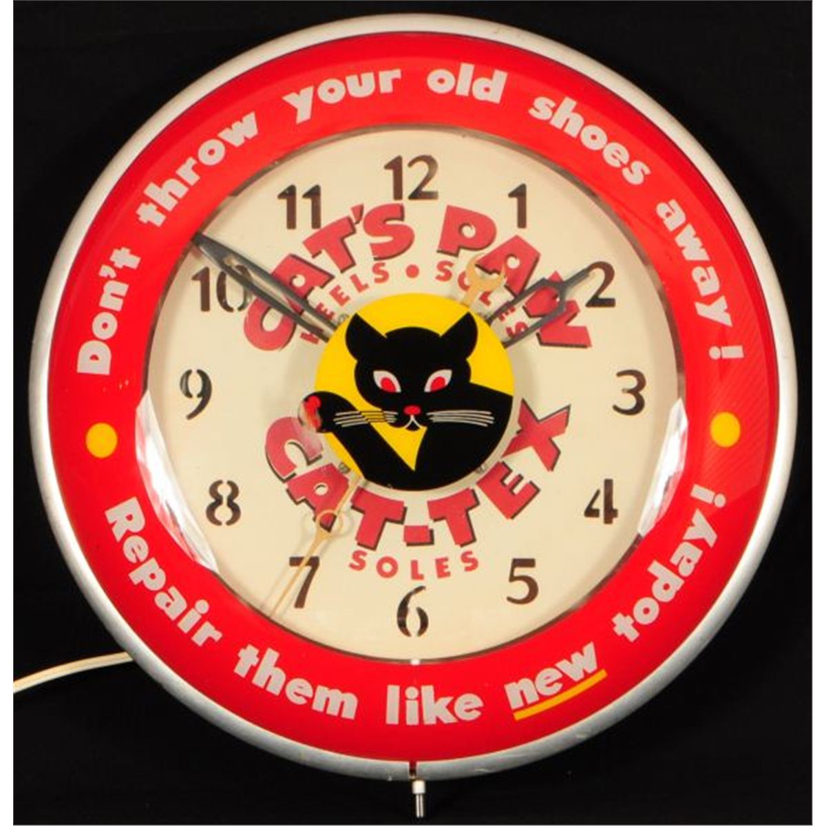 Cat's Paw Cat-Tex Soles Lighted Advertising Clock. Working Condition. Measures 15" diameter.