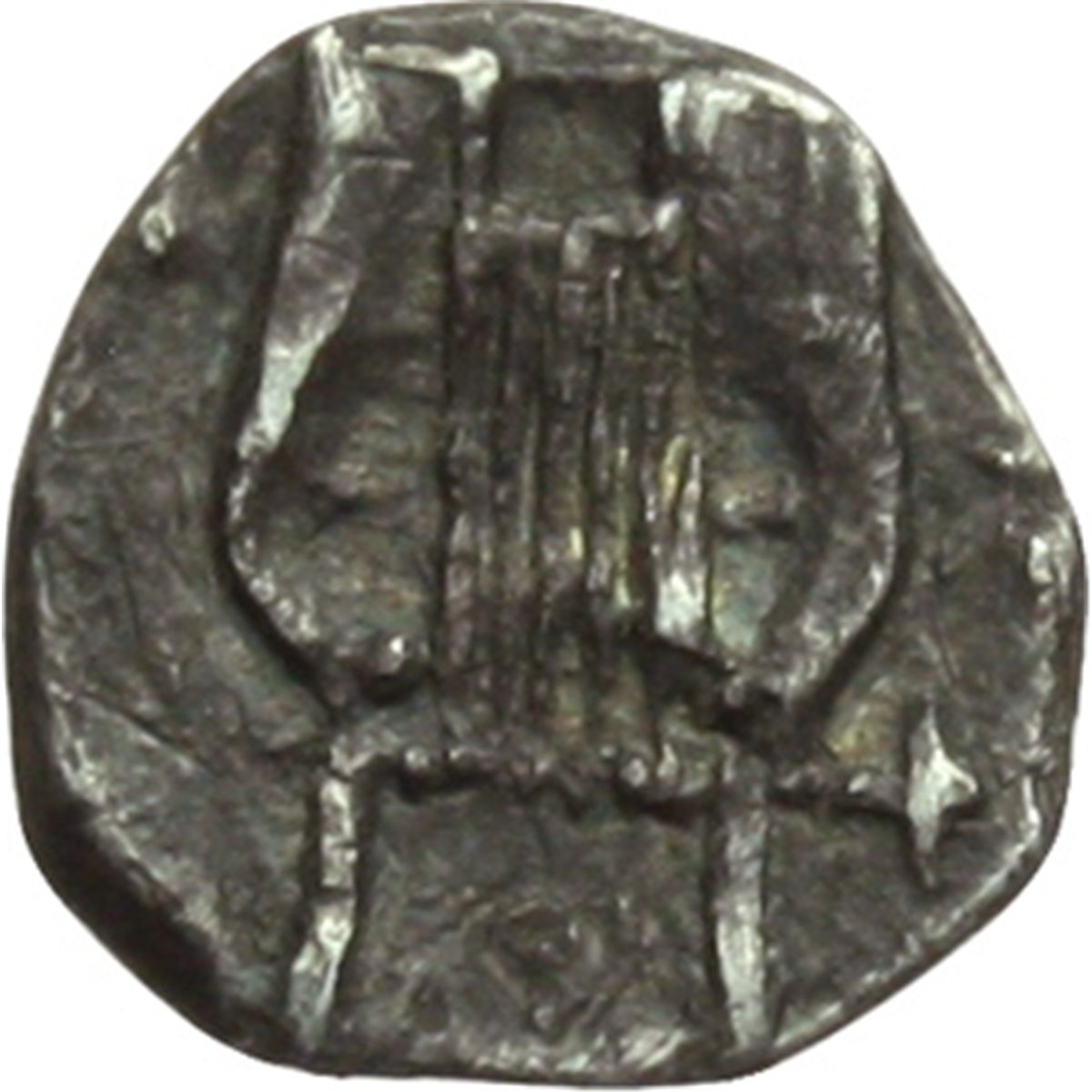 Mondo Greco. Sicilia. Catana. Trionkion, 476-404 a.C. D/ Testa di Apollo a destra. R/ Lyra. Cfr. Munzen und Medaillen 406,35 e Sternberg, 545. AG. g. 0.13 mm. 6.00 RRR. Della massima raritv†. Bel BB+.