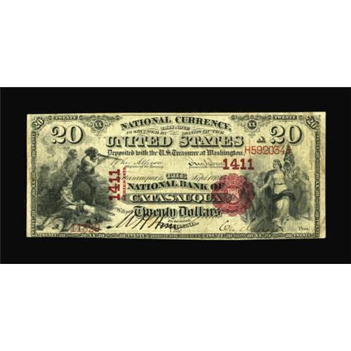 <B>Catasauqua, PA</B></I> - $20 1875 Fr. 431 <B>The NB of Catasauqua</B></I> Ch. # 1411<BR> We have long argued that First Charter twenties in all grades were one of the most undervalued of the National types, and, at long last, the market seems to agree, with examples selling for considerably higher figures in recent offerings. Once again, the Green Sheet is hopelessly behind the market here, as it is on so many of the scarcer National types, which would serve as a great purchasing aid if only the notes were available for sale. Serious bidders will relegate the "Sheet" to birdcage liner before entering a bid here. Nice <B>Fine+++.</B></I><BR><BR><b>Shipping:</b> Coins & Currency (<a target="_blank" href="http://www.heritageauctions.com/common/shipping.php">view shipping information</a>)