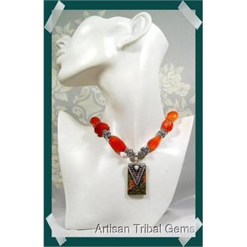 Vera has chosen brilliant sunset chalcedony combined a compelling agate center complimented by her favorite tribal silver. The necklace has an approximate length of 17" with a very impressive gram weight of 101 grams. Truly a luxurious one of a kind purchase for those that adore BIG and BOLD! The center agate pendant measures 45x25mm for perspective to size. For those not familiar with metric 25mm=1". Another exotic treasure from Vera at Artisan Tribal Gems and comes with out highest recommendations. (item 4752)