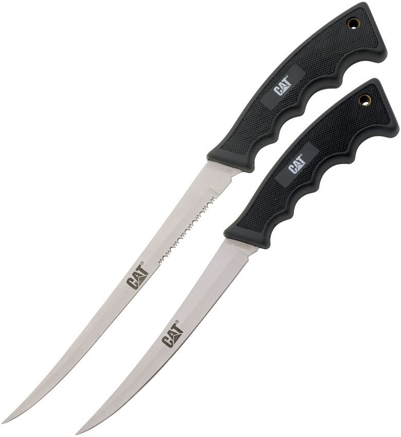 420 stainless blade. Black textured synthetic handle. Includes one 13.25" overall fillet knife with 8" partially serrated blade and one 11.25" overall fillet knife with 6" blade Black nylon belt sheath.