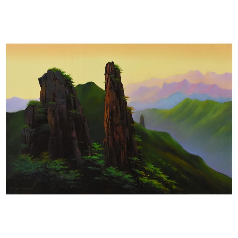 "Cathedral Mountain" is an original oil painting on canvas by Richard Leung, hand signed by the artist. Includes Letter of Authenticity. Measures approx. 30" x 20" (image).